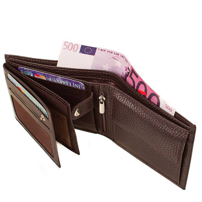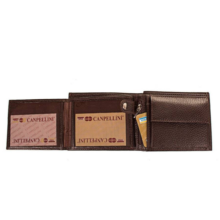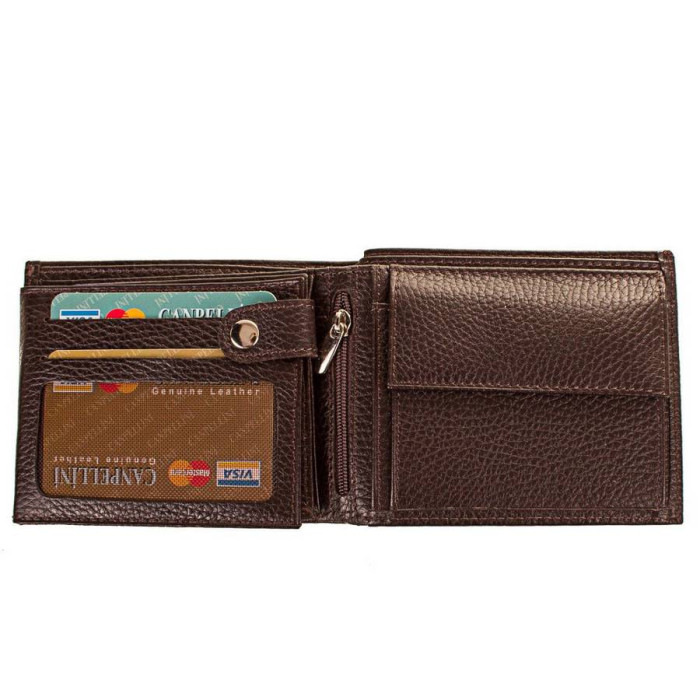 Кількість основних відділень (для купюр): 2. Відділення для фотокарток, перепусток, проїзних квитків та інших документів: 2. Відділення для візиток, банківських та дисконтних карток: 8. Одне з них має прозоре віконце і придатне для зберігання фотокарток і невеликих документів. Додаткові відділення: 3. Одне з них - на блискавці. Відділення для дрібниці: 1. Кишеня-монетниця закривається за допомогою клапана і механічної кнопки. Матеріал виробу: шкіра флотар. Колір: коричневий. Колір фурнітури: срібло. Розміри (X*Y*Z): 12*9,5*2,5 см. В розкритому вигляді ширина виробу становить 24 см. Аксесуар виконаний без застібки. Виріб упакований у фірмову коробку з щільного картону. Країна походження торгової марки Canpellini - Туреччина. Гарантія: 1 місяць.
