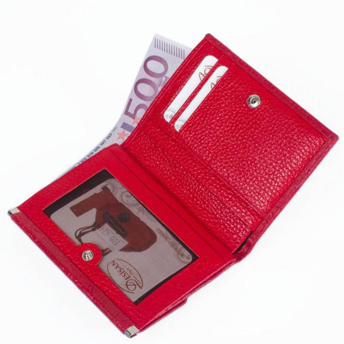 Кількість основних відділень (для купюр): 2. Відділення для фотокарток, перепусток, проїзних квитків та інших документів: 1 (має прозоре віконце). Відділення для візиток, банківських та дисконтних карток: 3. Додаткові відділення: 2. Відділення для дрібниці: 1. Кишеня-монетниця закривається за допомогою клапана і механічної кнопки. У ньому раположен невеликий накладної кишеньку. Матеріал виробу: шкіра з тисненням. Колір: червоний. Колір фурнітури: срібло. Розміри (X*Y*Z): 12*10*1,5 см. Аксесуар закривається за допомогою механічної кнопки. Виріб упаковано в фірмову картонну коробку. Країна походження ТМ Desisan - Туреччина. Гарантія: 1 місяць.