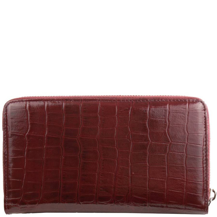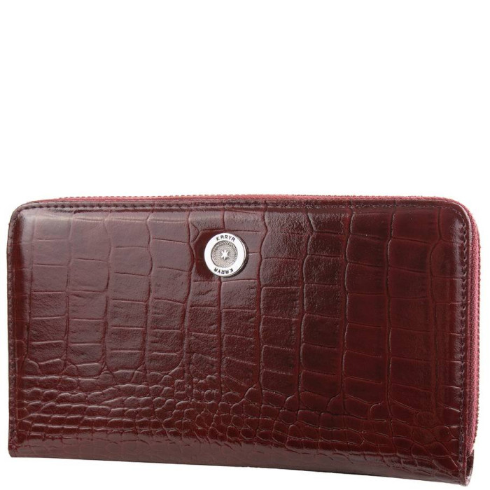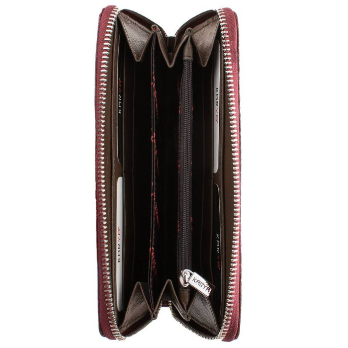 Розміри (X*Y*Z): 19*10,5*2,7 см. Кількість основних відділень (для купюр): 3. Відділення для візиток, банківських та дисконтних карток: 8. Додаткові відділення: 3. Кишеня-монетниця служить перегородкою між відділеннями для купюр і закривається на блискавку. Матеріал виробу: шкіра під змію. Колір виробу: бордовий. Колір фурнітури: срібло. Гаманець закривається за допомогою блискавки. Виріб упаковано в фірмову картонну коробку. Країна походження торгової марки Karya - Туреччина. Гарантія: 1 місяць.