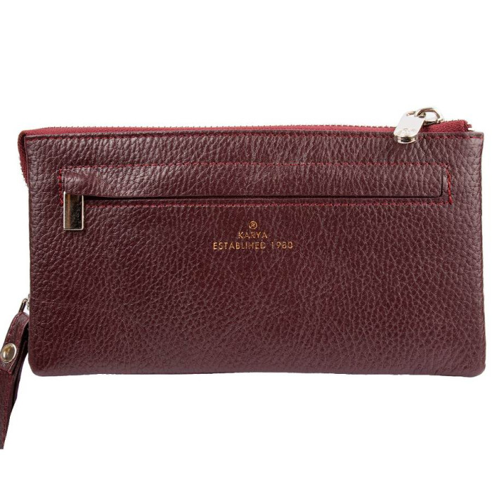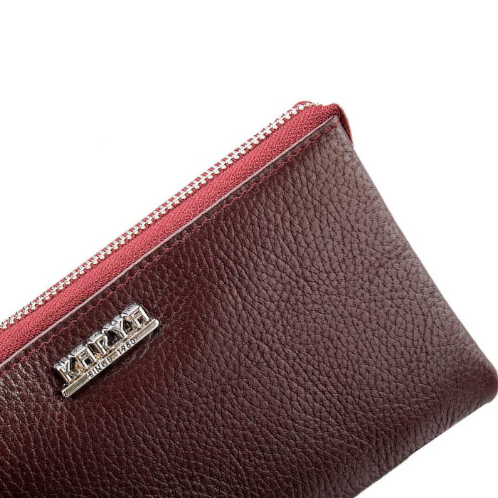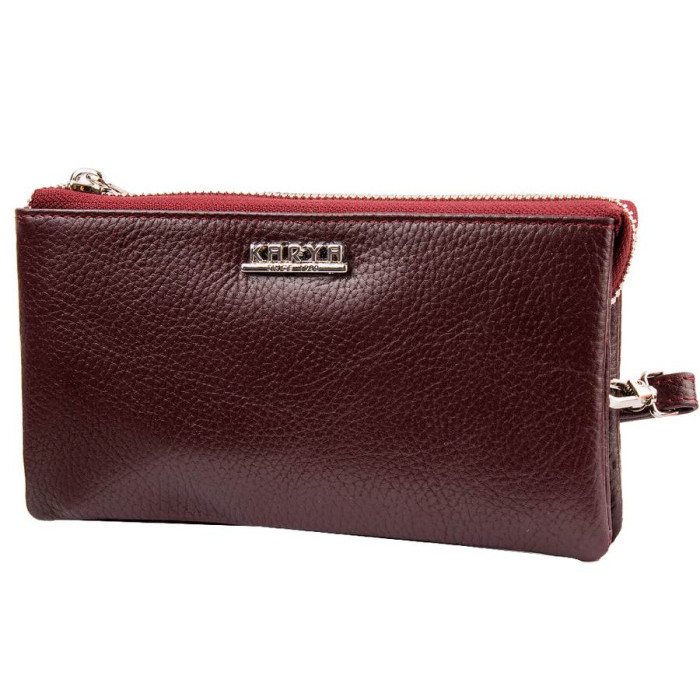 Розміри (X*Y*Z): 19*10*2,5 см. Колір: бордовий. Колір фурнітури: срібло. Кількість основних відділень (для купюр): 2. Кількість додаткових відділень: 2. У кожному з них є органайзер для зберігання дисконтних, банківських карток та візиток. Відділення для дрібниці: 1. Кишеня-монетниця закривається за допомогою застібки-блискавки. У комплект до моделі додається знімний зап'ястковий ремінець-петля. Його довжина не регулюється та становить 17,5 см. Матеріал виробу: шкіра. Аксесуар закривається за допомогою блискавки. Виріб упакований у картонну коробку. Країна походження TM Karya - Туреччина. Гарантія: 1 місяць.