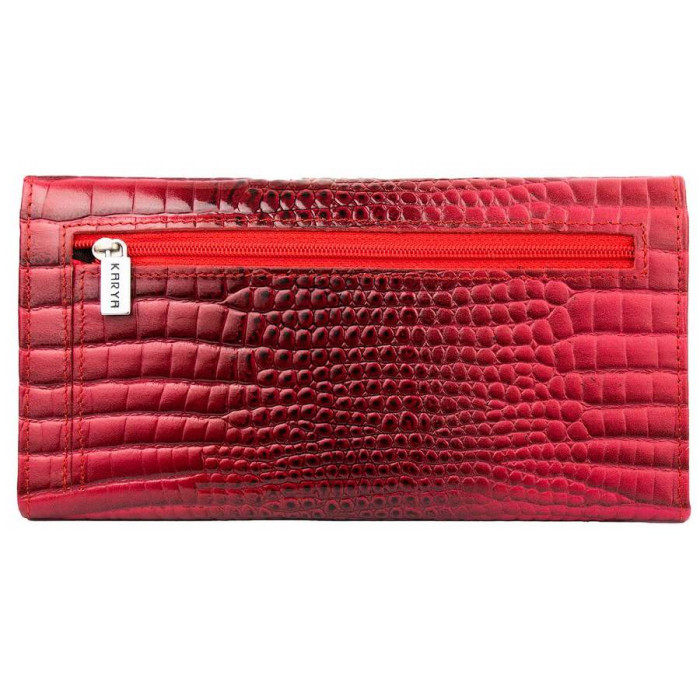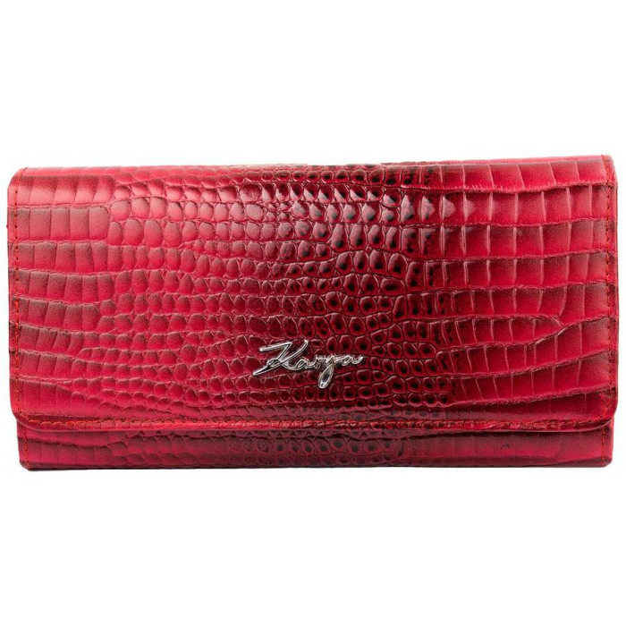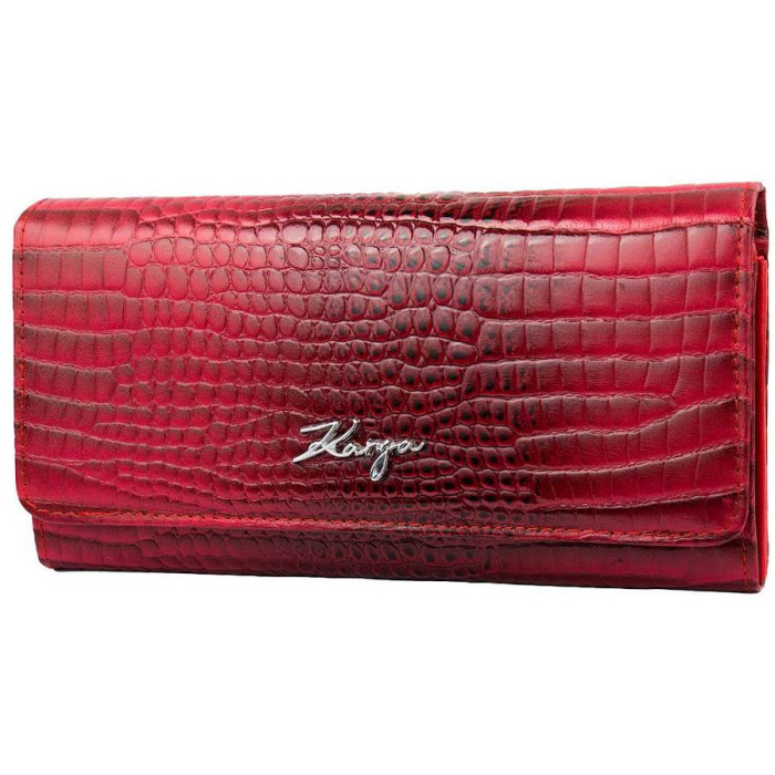 Насыщенные оттенки красного, градиентно переходящие в очень тёмные тона, формируют эффектный вид этого кошелька наряду с натуральной кожей, которую украшает модное тиснение-рисунок под рептабою. Аксессуар торговой марки KARYA стильный и женственный, в меру яркий. Такой вариант украсит гардероб и готов служить долго, поскольку изготовлен из высококачественных материалов и крепко прошит по швам. Большой клапан горизонтального полноформатного кошелька-портмоне украшает фирменная эмблема ярко-серебристого цвета, которая гармонично вписана в ансамбль. Устройство изделия рассчитано на комфортное обращение с купюрами, монетами, карточками. В нашем интернет-магазине купить женский кожаный кошелёк Вы можете по выгодной цене уже сегодня.