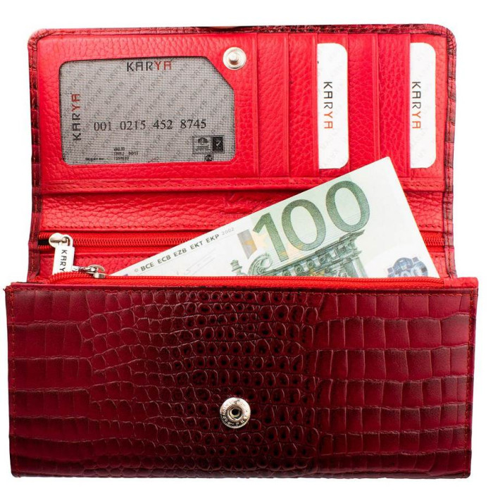 Розміри (X * Y * Z): 19 * 10 * 2,8 см. Колір: червоний. Колір фурнітури: срібло. Матеріал виробу: шкіра. Кількість відділень для купюр: 3. Гарантія: 1 місяць. Відділення для дрібниці: 1. Закривається за допомогою блискавки. Додаткові відділення: 3. Одне з них закривається на блискавку. На тильній стороні виробу є додаткове відділення, яке закривається на блискавку. Відділення з прозорим віконцем: 1. Відділення для карт: 5. Аксесуар застібається за допомогою механічної кнопки . Виріб упаковано в фірмову картонну коробку. Країна походження торгової марки KARYA - Туреччина.