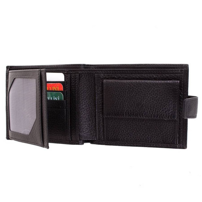 Кількість основних відділень (для купюр): 2. Додаткові відділення: 3. Відділення для документів, фотокарт і перепусток: 2 (мають прозорі віконця). Відділення для візиток, банківських та дисконтних карток: 4. Відділення для дрібниці: 1. Монетниця закривається за допомогою клапана і механічної кнопки. Матеріал виробу: шкіра флотар. Колір: чорний. Колір фурнітури: срібло. Розміри (X*Y*Z): 12,5*10*2,5 см. Ширина в розкритому вигляді - 24,5 см. Аксесуар закривається за допомогою хлястика на механічній кнопці. Виріб упаковано в фірмову картонну коробку. Країна походження ТМ Canpellini - Туреччина. Гарантія: 1 місяць.