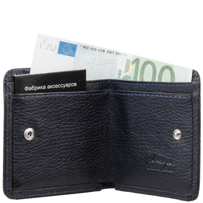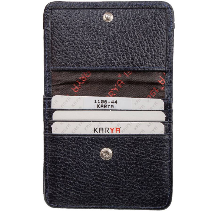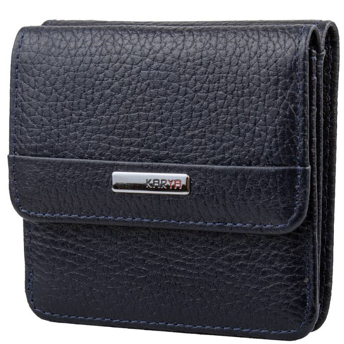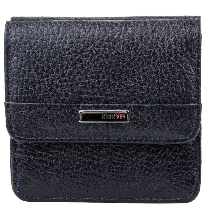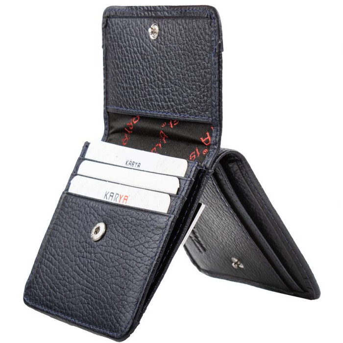 Кількість основних відділень (для купюр): 2. Додаткові відділення: 1. Відділення для візиток, банківських та дисконтних карток: 3. Відділення для дрібниці: 1. Матеріал виробу: шкіра. Колір: темний синій. Колір фурнітури: срібло. Розміри (X*Y*Z): 9,5*9,5*2,5 см. Ширина в розкритому вигляді 18 см. Аксесуар закривається за допомогою механічної кнопки. Виріб упаковано в фірмову картонну коробку. Країна походження ТМ Karya - Туреччина. Гарантія: 1 місяць.