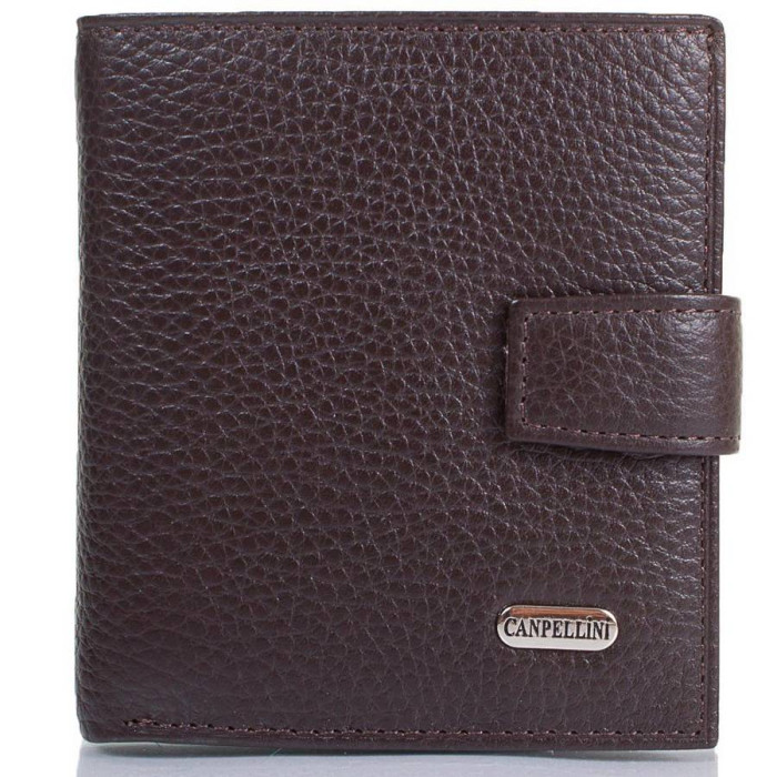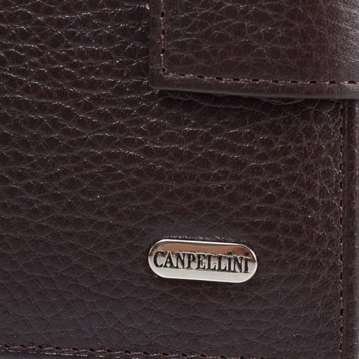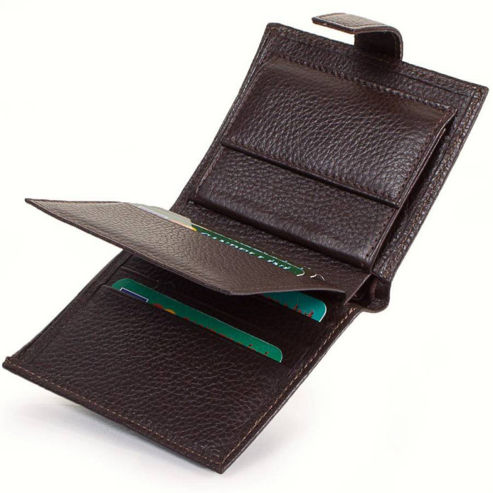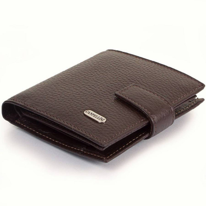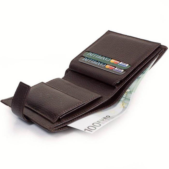 Кількість основних відділень (для купюр): 2. Відділення для фотокарток, перепусток, проїзних квитків та інших документів: 1 (має прозоре віконце). Відділення для візиток, банківських та дисконтних карток: 5. Додаткові відділення: 2. Відділення для дрібниці: 1. Кишеня-монетниця закривається за допомогою клапана і механічної кнопки. Матеріал виробу: шкіра флотар. Колір: коричневий. Колір фурнітури: срібло. Розміри (X*Y*Z): 10*11*2,6 см. В розкритому вигляді ширина виробу становить 20 см. Аксесуар закривається за допомогою хлястика на механічній кнопці. Виріб упаковано в фірмову картонну коробку. Країна походження ТМ Canpellini - Туреччина. Гарантія: 1 місяць.