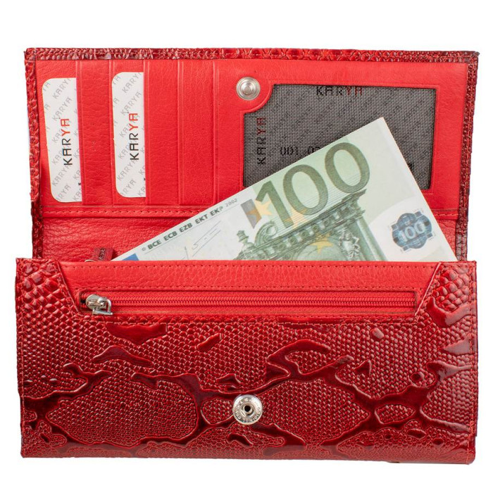 Розміри (X*Y*Z): 19 х 9 х 3 см. Колір: червоний. Колір фурнітури:срібло. Матеріал виробу:шкіра. Кількість основних відділень (для купюр): 3. Додаткові відділення:4. Відділення для карток: 13. Відділення з прозорим віконцем: 1. Відділення для дрібниці:2. Закриваються за допомогою блискавки. Аксесуар закривається за допомогою механічної застібки.. Виріб упакований у фірмову картонну коробку. Країна походження ТМ Karya - Туреччина. Гарантія: 1 місяць.