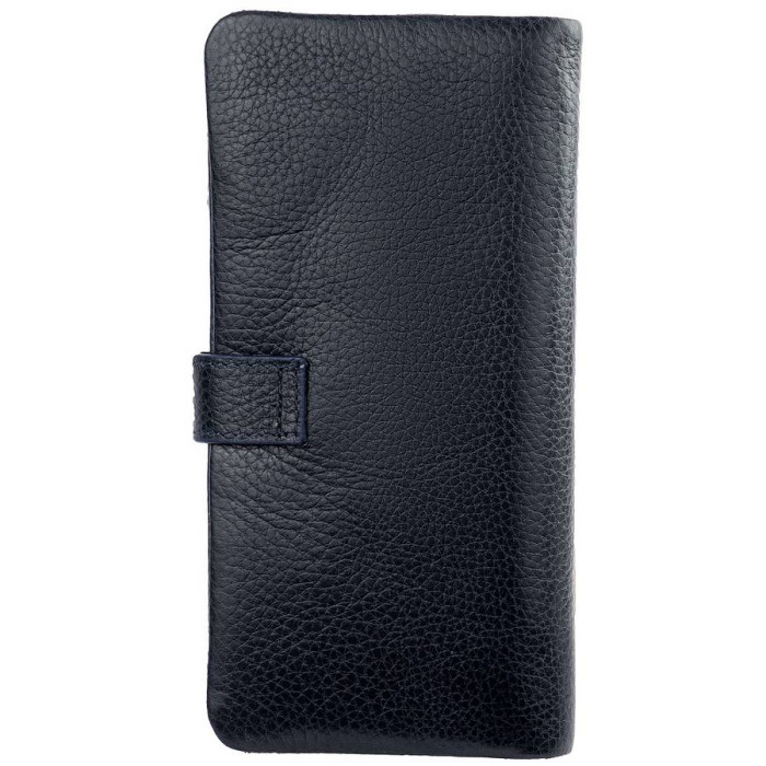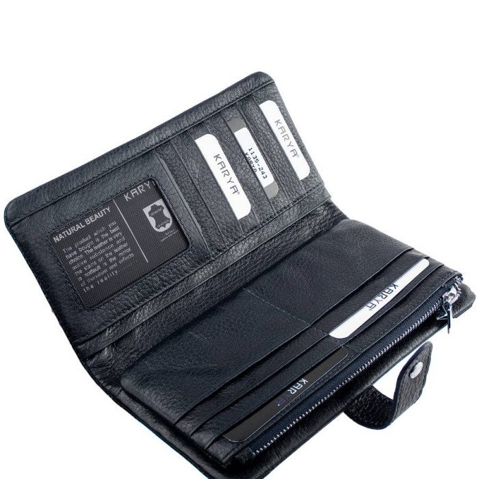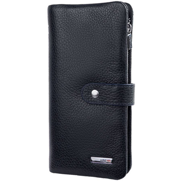 Розміри (X*Y*Z): 9,5*18,5*2,5 см. Ширина в розкритому вигляді – 19,5 см. Кількість основних відділень (для купюр): 3. Відділення для візиток, банківських та дисконтних карток: 13. Додаткові відділення: 2. Одне з них закривається на блискавку. Відділення для документів: 1 (мають прозорі віконця). Кишеня-монетниця знаходиться посередині гаманця і закривається на блискавку. Матеріал виробу: шкіра. Колір виробу: синій. Колір фурнітури: срібло. Гаманець закривається за допомогою хлястика на кнопці. Виріб упаковано в фірмову картонну коробку. Країна походження торгової марки Karya - Туреччина. Гарантія: 1 місяць.