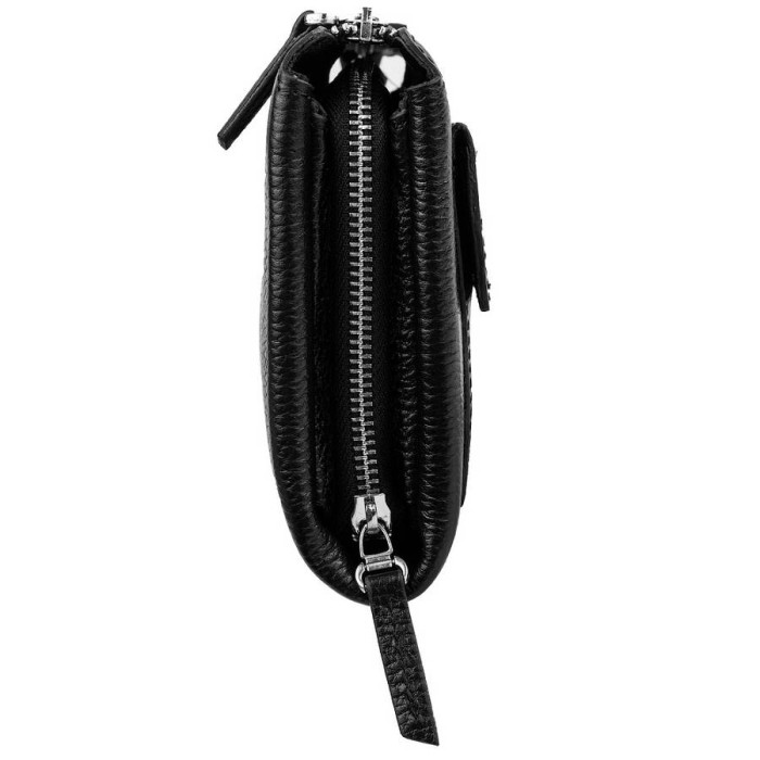 Зовнішні розміри: 23*14,5*5 см. Кількість основних відділень: 3. Всередині першого є 1 накладна кишеня і 3 відділення для візиток. Друге відділення закривається на блискавку і всередині має 2 відділи, між якими є кишеня-перегородка на блискавці, тут також є накладна кишеня для візитки або банківської карти з прозорим віконцем. Всередині третього відділення є 1 прорізна кишеня на блискавці і 3 відділення для візиток. На лицьовій стороні борсетку є 1 накладна кишеня на магнітній застібці. Аксесуар придатний для носіння в руці. Блискавка переходить в ручку на боці виробу, за яку борсетку зручно тримати. Матеріал: шкіра. Колір: чорний. Колір фурнітури: срібло. Виріб закривається при блискавки. Документи формату А4 не поміщаються у виробі. Виріб упаковано в тканинний мішечок. Країна походження ТМ BOND - Туреччина. Гарантія: 3 місяці.