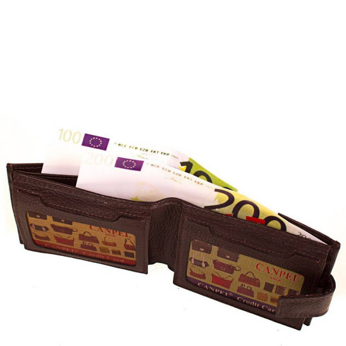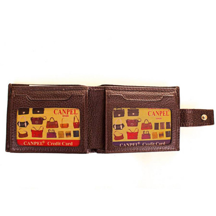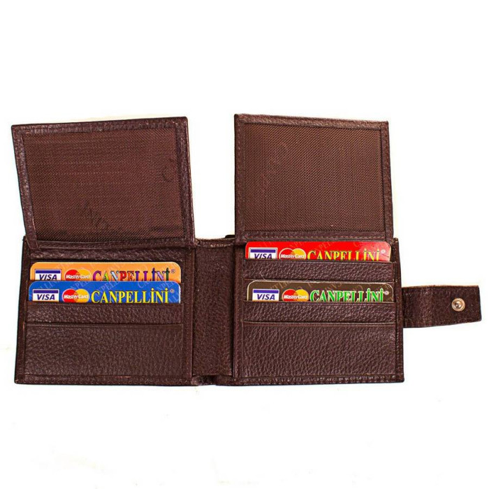 Кількість основних відділень (для купюр): 2. Додаткові відділення: 2. Відділення для документів, фотокарт і перепусток: 4 (мають прозорі віконця). Відділення для візиток, банківських та дисконтних карток: 8. Матеріал виробу: шкіра флотар. Колір: темно-коричневий. Колір фурнітури: срібло. Розміри (X*Y*Z): 11*8,4*2,5 см. В розкритому вигляді ширина виробу становить 22 см. Аксесуар закривається за допомогою хлястика і механічної кнопки. Виріб упаковано в фірмову картонну коробку. Країна походження ТМ Canpellini - Туреччина. Гарантія: 1 місяць.