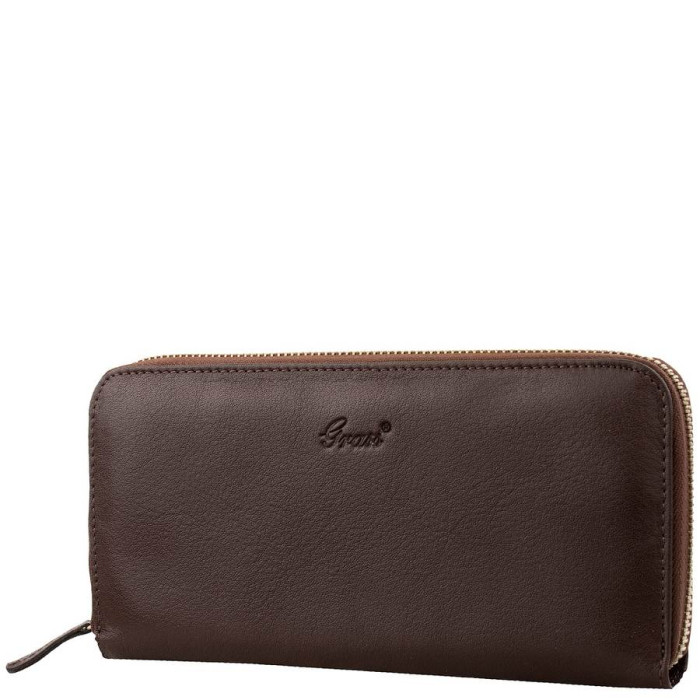 Великий гаманець на блискавці зручний в обігу, таку модель вибирають багато жінок. Застібка вшита по довгій лінії з плавними поворотами на куточках вироби, бігунок рухається легко, при розкритті власниця добре бачить вміст. Аксесуар, запропонований торговою маркою GRASS, - зразковий екземпляр такої моделі. Всередині-просторі відділення і кишеня-монетниця, шість кишеньок для банківських та інших карток відповідного розміру. Зовнішній вигляд радує лаконічністю-лицьову сторону прикрашає лише невеликий фірмовий відбиток турецького шкіргалантерейного бренду. Коричневий колір натуральної шкіри з гладкою матовою поверхнею акуратно доповнює металевий сріблястий блиск зубчиків застібки-блискавки. Купити гаманець першосортної якості можна в магазині "OlaBags" за найвигіднішою ціною.