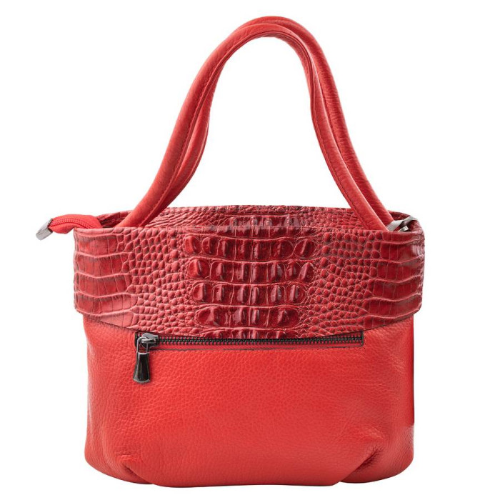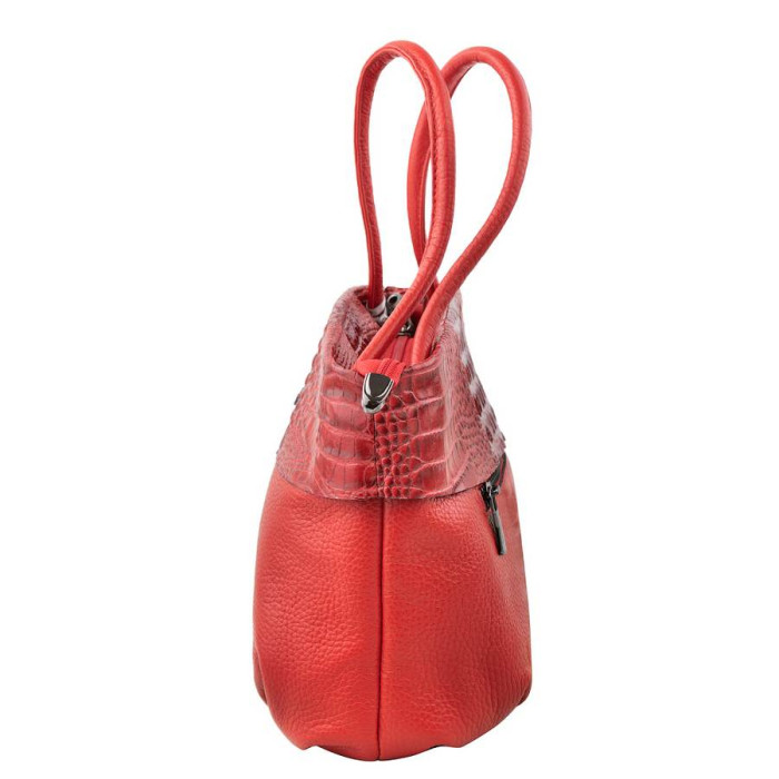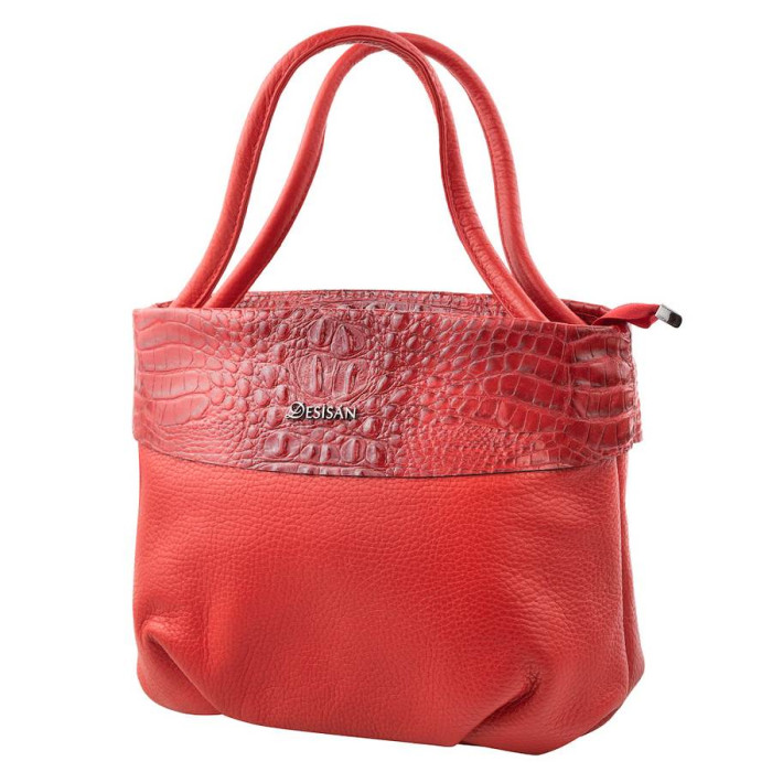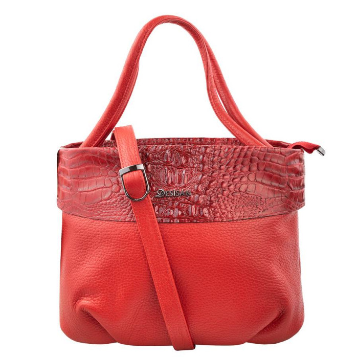 Фасон цієї жіночої сумочки особливо добре підійде до гардеробу романтичного або ділового характеру, повсякденному одязі – стильний ридикюль досить універсальний. Червоний колір варіюється в фактурах і відтінках – добротно-зерниста поверхня сусідить з рельєфно-тисненої; верхній відворот під шкіру рептилії служить оригінальним декором. Шкіряний виріб турецького бренду DESISAN стане гідним доповненням наряду, яскраво позначаючи стиль власниці. Міцні, не широкі ручки доповнюються пристібних ременем. М'які складки навколо овального дна створюють обсяг і підкреслюють жіночність моделі. Внутрішнє пристрій зручно наявністю двох відділень з кишенею-перегородкою, щільна підкладка і фурнітура під чорнене срібло додають колірного різноманіття аксесуару. Купити цю сумку можна в магазині «ЕМІЛІ». Ціна з урахуванням першосортного якості і довговічності – вигідна.