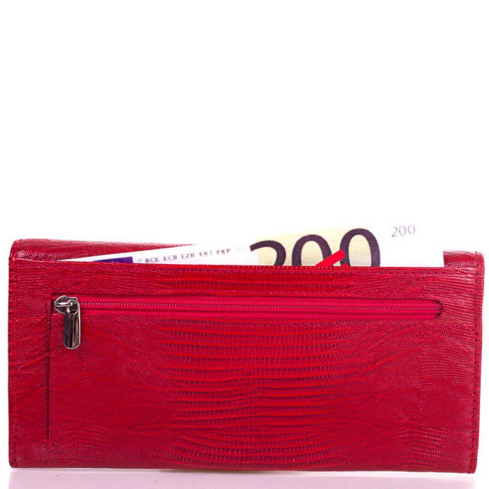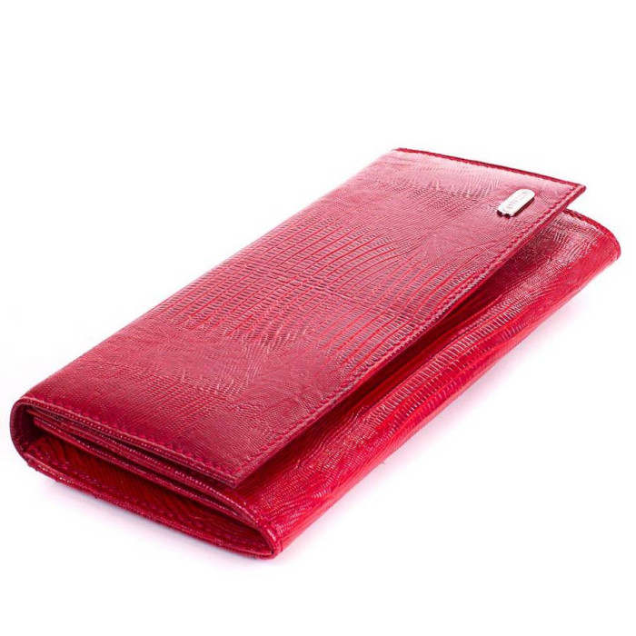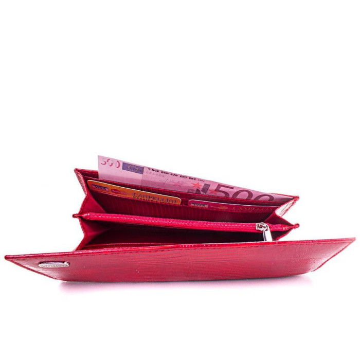 Кількість основних відділень (для купюр): 4. Додаткові відділення: 2. Відділення для візиток, банківських та дисконтних карток: 10. Відділення для дрібниці: 1. Монетниця закривається за допомогою блискавки. На тильній стороні гаманець має один великий горизонтальний накладної кишені і один прорізна кишеня на блискавці. Матеріал виробу: лакована шкіра під змію. Колір: червоний. Колір фурнітури: срібло. Розміри (X*Y*Z): 19*9,5*2,7 см. Аксесуар закривається за допомогою клапана і механічної кнопки. Виріб упаковано в фірмову картонну коробку. Країна походження ТМ Canpellini - Туреччина. Гарантія: 1 місяць.