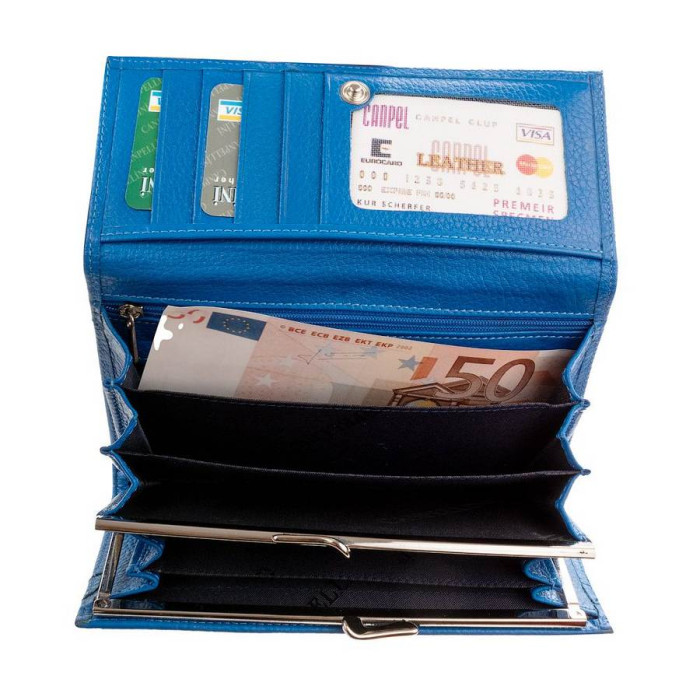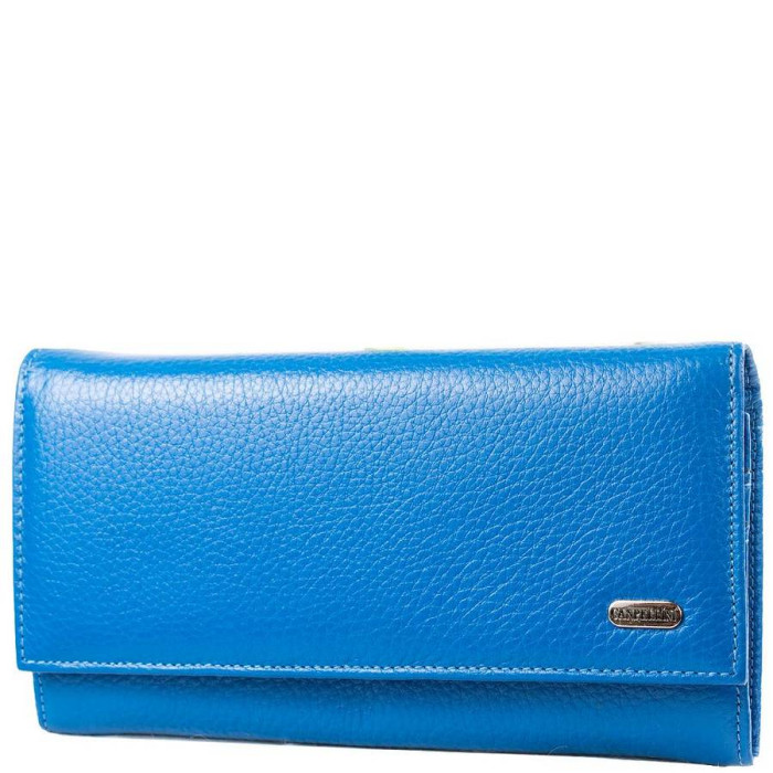 Розміри (X * Y * Z): 19 х 10 х 3 см. Матеріал виробу: шкіра. Колір: синій. Колір фурнітури: срібло. Кількість відділень для купюр: 3. Гарантія: 1 місяць. Додаткові відділення: 5. Одне з них знаходиться зовні, а ще одне закривається на блискавку. Відділення для карт: 4. Відділення з прозорим віконцем: 1. Відділення для дрібниці: 1. Монетниця ділиться на два відділи і закривається за допомогою фермуаром. Аксесуар застібається за допомогою клапана на механічній кнопці. Виріб упаковано в фірмову картонну коробку. Країна походження ТМ Canpellini - Туреччина.