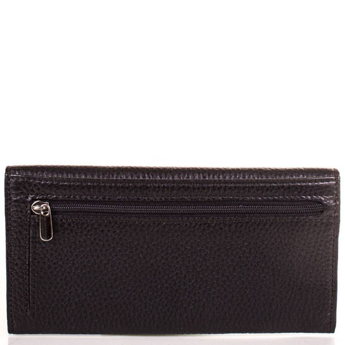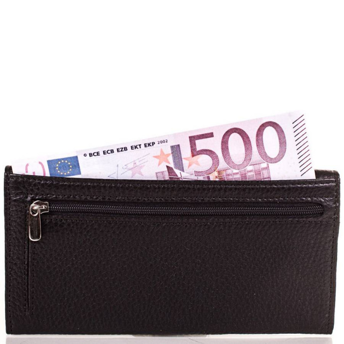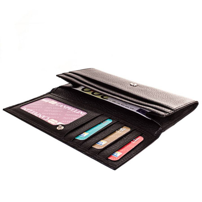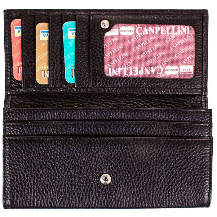 Кількість основних відділень (для купюр): 1. Додаткові відділення: 3. Відділення для документів, фотокарт і перепусток: 1 (має прозоре віконце). Відділення для візиток, банківських та дисконтних карток: 5. На тильній стороні гаманець має одну велику горизонтальну накладну кишеню, а також прорізна кишеня на блискавці. Матеріал виробу: шкіра флотар. Колір: чорний. Колір фурнітури: срібло. Розміри (X*Y*Z): 17,5*9*2 см. Аксесуар закривається за допомогою механічної кнопки. Виріб упаковано в фірмову картонну коробку. Країна походження торгової марки Canpellini - Туреччина. Гарантія: 1 місяць.
