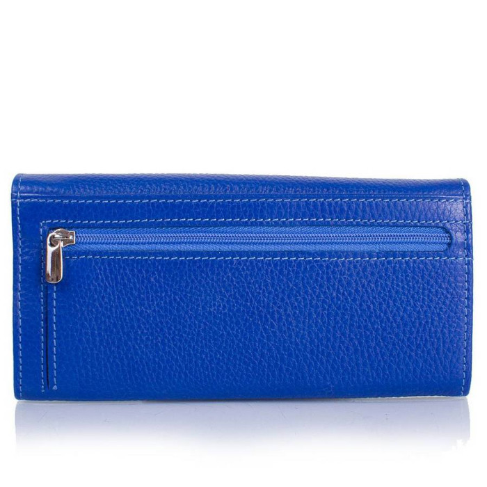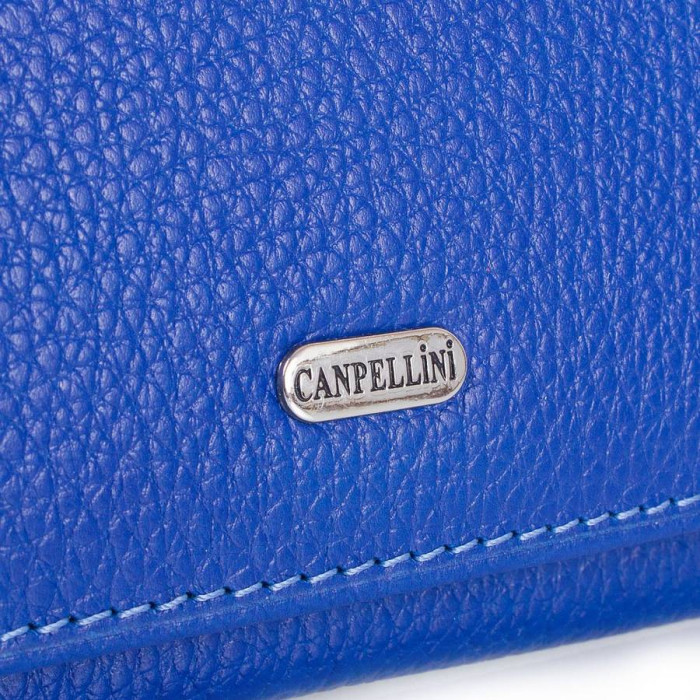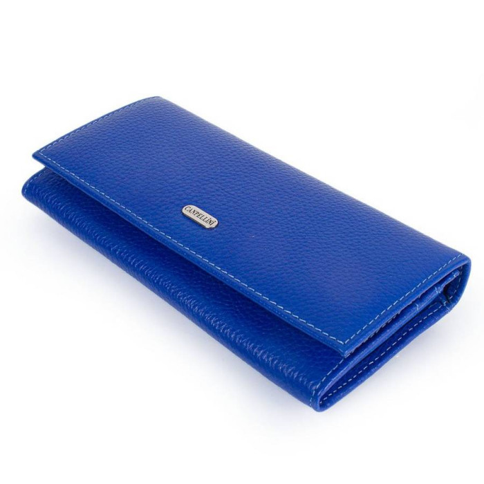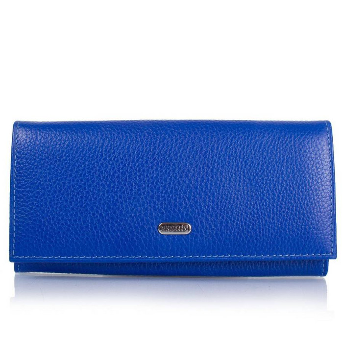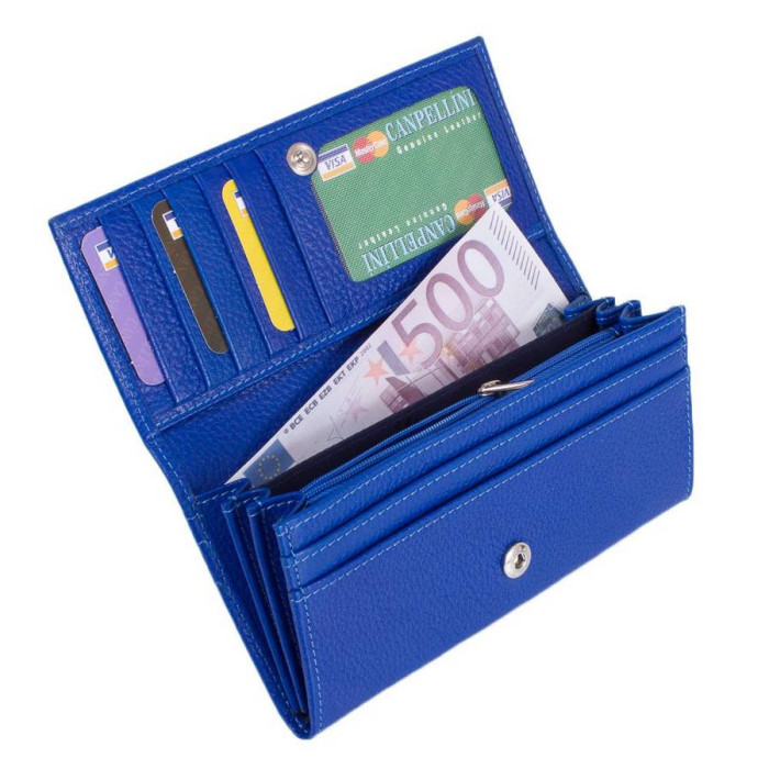 Кількість основних відділень (для купюр): 3. Відділення для фотокарток, перепусток, проїзних квитків та інших документів: 1 (має прозоре віконце). Відділення для візиток, банківських та дисконтних карток: 5. Додаткові відділення: 3. На тильній стороні гаманець має одну велику горизонтальну накладну кишеню, а також прорізна кишеня на блискавці. Відділення для дрібниці: 1. Кишеню-монетниця закривається за допомогою застібки-блискавки. Матеріал виробу: шкіра флотар. Колір: блакитно-синій. Колір фурнітури: срібло. Розміри (X*Y*Z): 18,5*9,5*3 см. Аксесуар закривається за допомогою клапана на механічній кнопці. Виріб упаковано в фірмову картонну коробку. Країна походження ТМ Canpellini - Туреччина. Гарантія: 1 місяць.