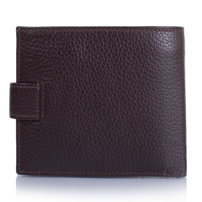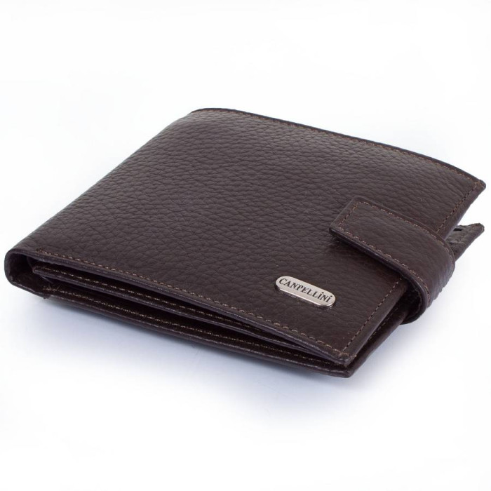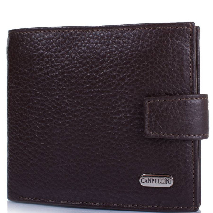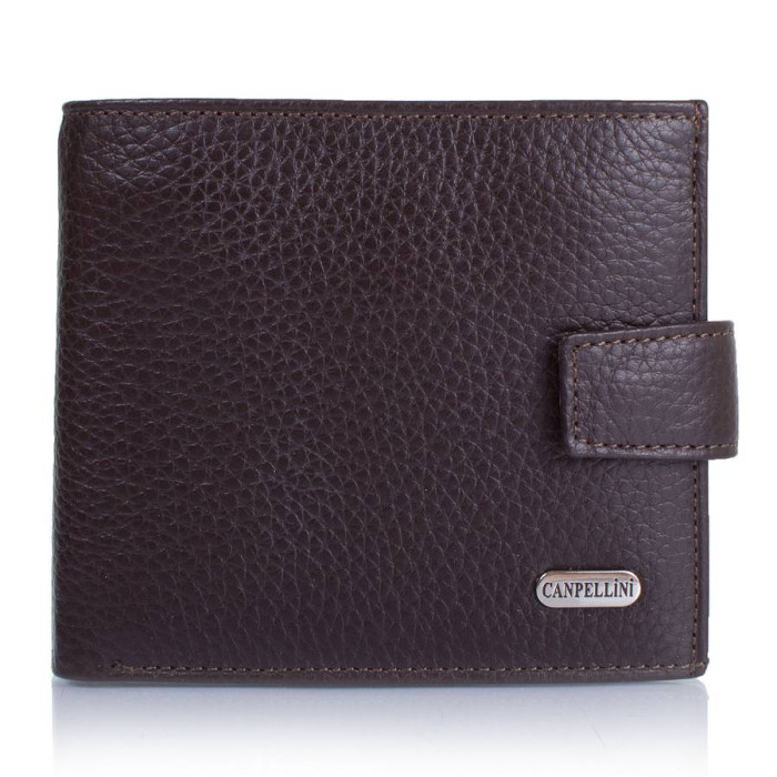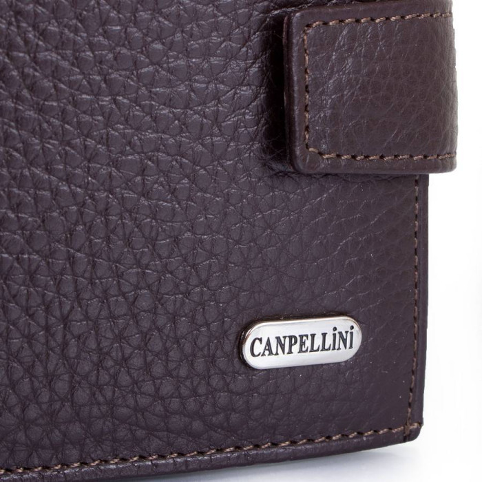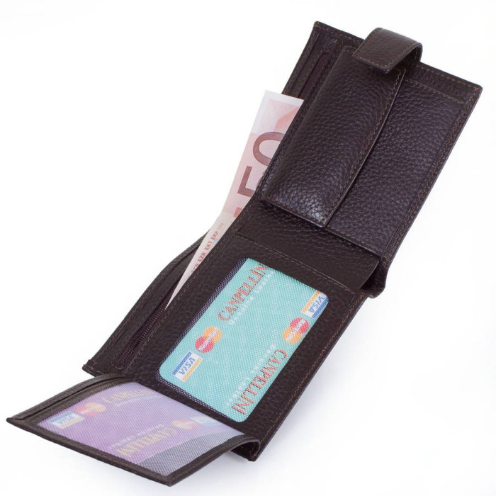 Кількість основних відділень (для купюр): 1. Відділення для фотокарток, перепусток, проїзних квитків та інших документів: 2 (мають прозоре віконце). Відділення для візиток, банківських та дисконтних карток: 3. Додаткові відділення: 1. Прорізний кишеню: 1 (на блискавці). Відділення для дрібниці: 1. Кишеня-монетниця закривається за допомогою клапана і механічної кнопки. Матеріал виробу: шкіра. Колір: темний коричневий. Колір фурнітури: срібло. Розміри (X*Y*Z): 11,3*10*2,5 см. В розкритому вигляді ширина виробу становить 22,5 см. Аксесуар закривається за допомогою хлястика на механічній кнопці. Виріб упаковано в фірмову картонну коробку. Країна походження ТМ Canpellini - Туреччина. Гарантія: 1 місяць.