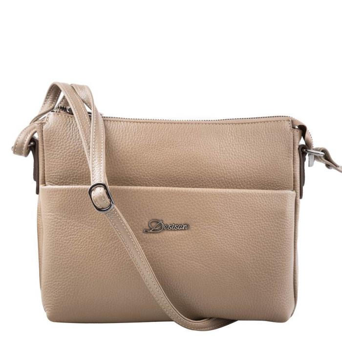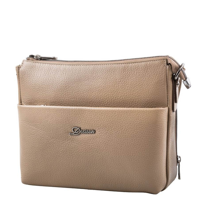 З цією оригінальною сумочкою в гардеробі у Вас завжди буде місце для повсякденно-необхідних предметів, які традиційно знаходяться в побуті. Невеликі розміри і хороша місткість, зручні просторі зовнішні кишені, стильний дизайн привертають увагу до моделі торгової марки ДЕСІСАН. Універсальний бежевий колір красиво доповнюється фурнітурою (особливе місце займають блискавки з металевими зубцями) під чорнене срібло. Пристрій виробу і його акуратна форма, першосортна якість шкіряного аксесуара допоможуть вам відчувати себе впевнено в будь-якій ситуації. Міцні шви і оздоблювальні строчки, щільна підкладка, увага виробника до кожної деталі гарантують хороший запас міцності цієї сумки. Купити брендову обновку за вигідною ціною вас запрошує наш магазин.