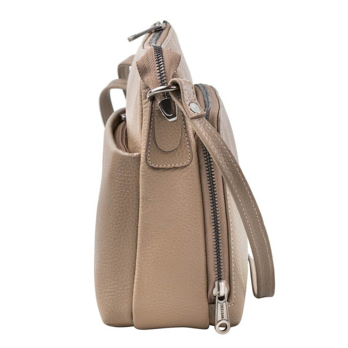 Кількість основних відділень: 2. Всередині є накладна кишеня, прорізна кишеня на блискавці, кишеня-перегородка на блискавці. На лицьовій і тильній сторонах є по одній накладній кишені на блискавці. Модель має незнімний плечовий ремінь. Його довжина регулюється (максимально-140 см). Матеріал підкладки: щільна тканина. Матеріал виробу: шкіра. Колір: Бежевий. Колір фурнітури: чорне срібло. Розміри (X * Y * Z): 26,5*22*11 см. Сумка закривається блискавкою. Виріб упаковано в поліетиленовий пакет. Країна походження торгової марки Desisan-Туреччина. Гарантія: 3 місяці.