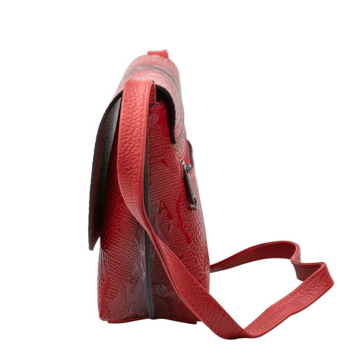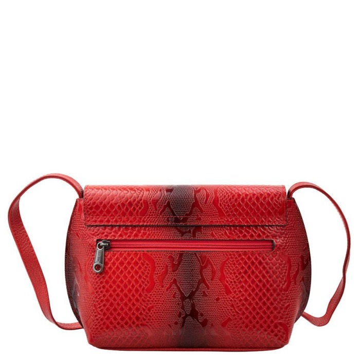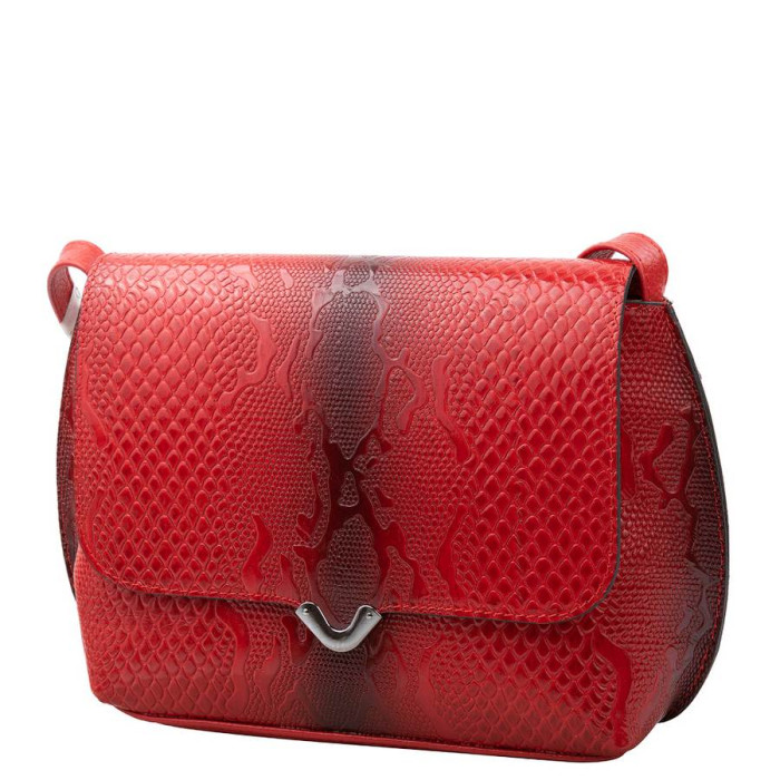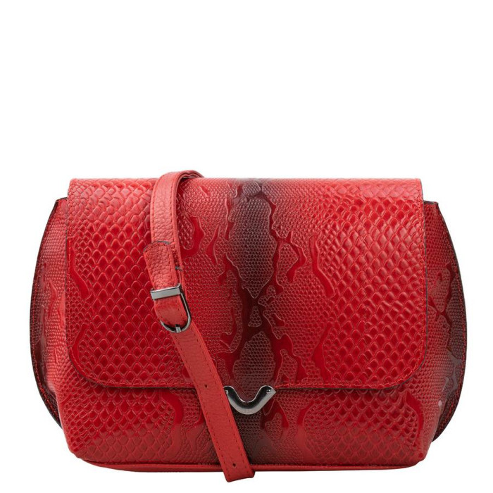 Оригінальна форма цієї жіночої сумочки з бічними «вушками»-заокругленнями виходить за рахунок жорстко прострочених швів з боків. Вони виконані зрізами назовні і формують фасон нарівні з червоним кольором добротної натуральної шкіри. Матеріал відзначений тисненням під крокодила і часткової лакуванням, забарвлення градієнтно змінюється від яскравого тону до майже чорного. Настільки "фасоністая" штучка стане помітною деталлю гардероба і послужить власниці на славу. Компактний аксесуар з плечовим ремінцем закривається клапаном з фігурним "куточком" по центру, посиленим металевою деталлю фурнітури. Дно аксесуара щільне, за рахунок цього він стійкий, що теж важливо в різних ситуаціях. У магазині "OlaBags" купити стильну брендову сумку фірми DESISAN можна за вигідною ціною вже сьогодні.