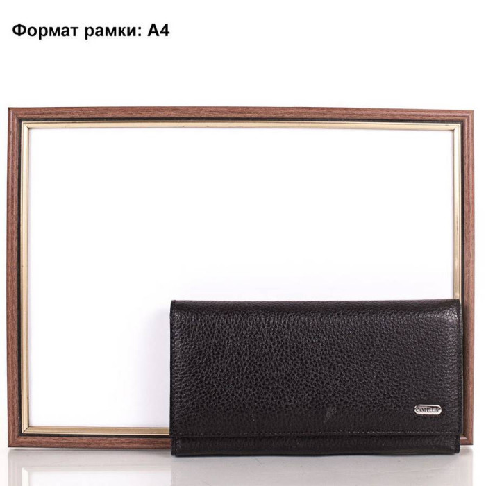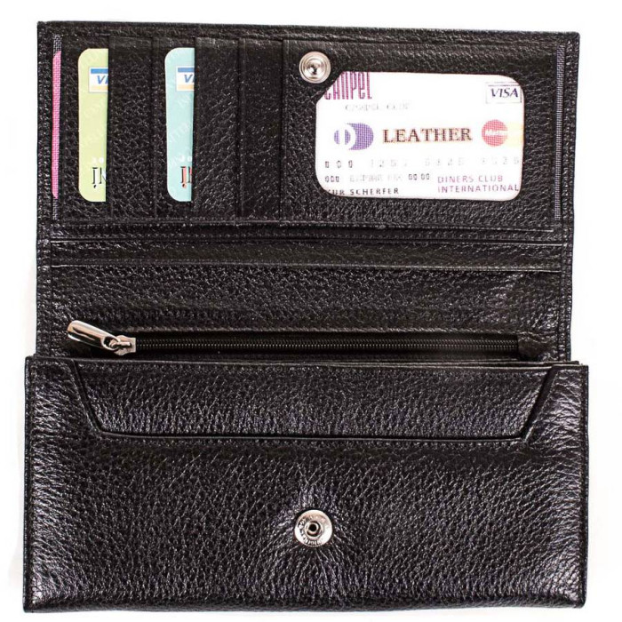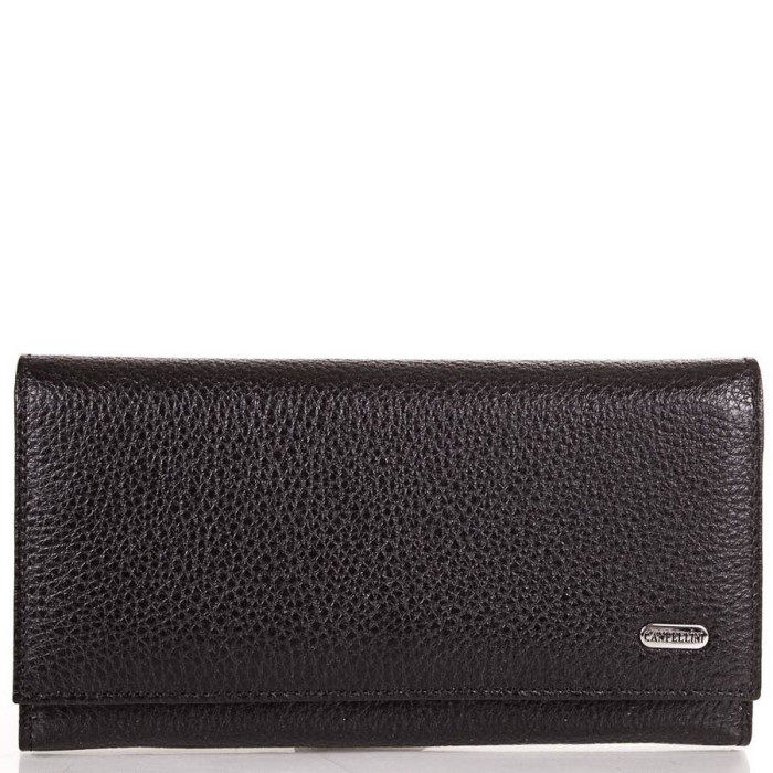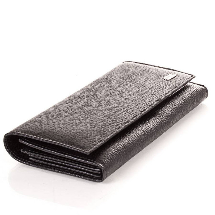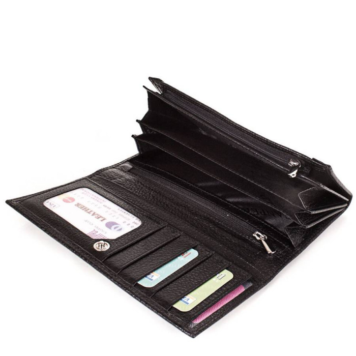 Кількість основних відділень (для купюр): 3. Додаткові відділення: 2. Відділення для документів, фотокарт і перепусток: 3 (мають прозорі віконця). Прорізні кишені: 1 (на блискавці). Відділення для візиток, банківських та дисконтних карток: 4. Відділення для дрібниці: 1. Монетниця закривається за допомогою блискавки. Матеріал виробу: шкіра флотар. Колір: чорний. Колір фурнітури: срібло. Розміри (X*Y*Z): 19,3*10,4*3,2 см. Аксесуар закривається за допомогою клапана і механічної кнопки. Виріб упаковано в фірмову картонну коробку. Країна походження торгової марки Canpellini - Туреччина. Гарантія: 1 місяць.