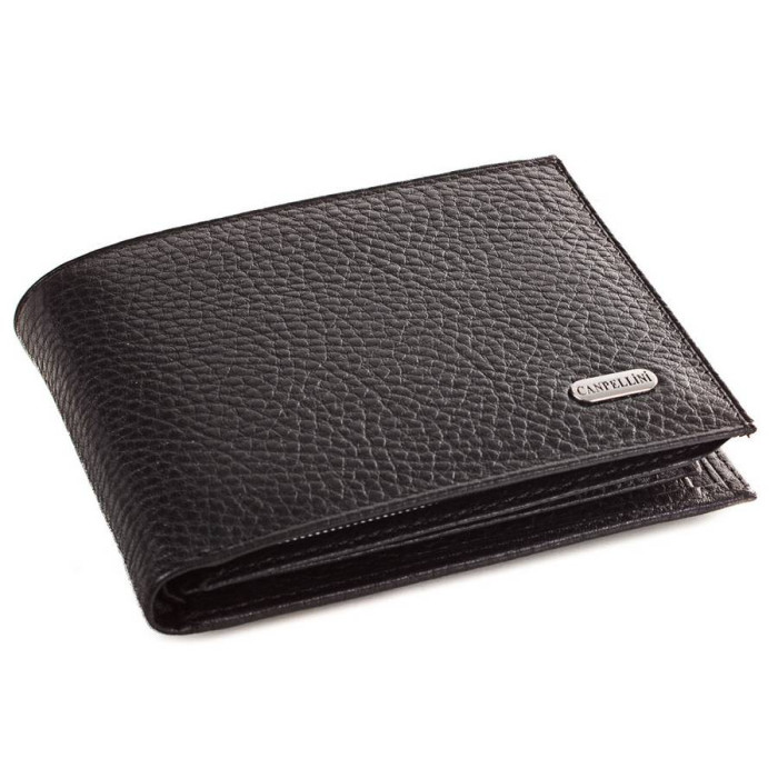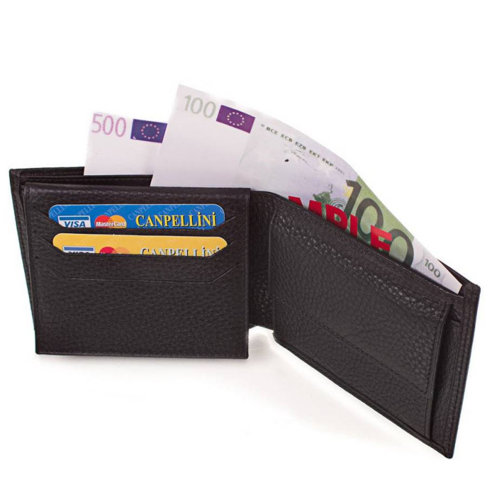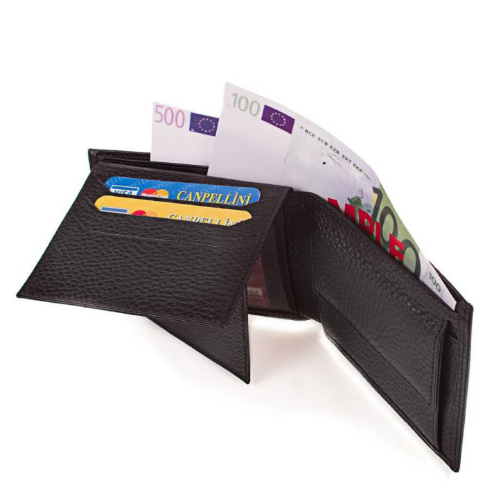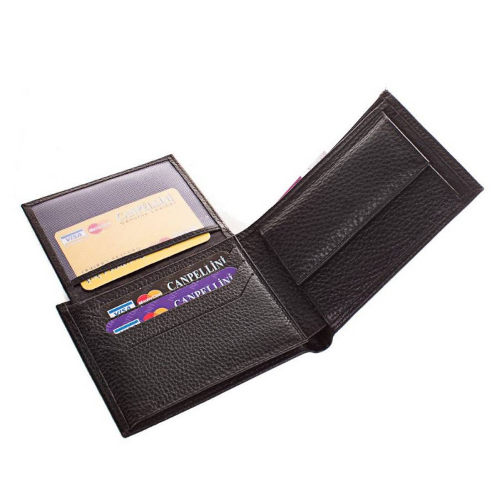 Кількість основних відділень (для купюр): 2. Відділення для фотокарток, перепусток, проїзних квитків та інших документів: 3. Відділення для візиток, банківських та дисконтних карток: 6. Відділення для дрібниці: 1. Кишеня-монетниця закривається за допомогою клапана і механічної кнопки. Матеріал виробу: шкіра флотар. Колір: чорний. Колір фурнітури: срібло. Розміри (X*Y*Z): 12,5*9,7*2 см. В розкритому вигляді ширина виробу становить 24,5 см. Аксесуар выплнен без застібки. Виріб упакований у фірмову коробку з щільного картону. Країна походження торгової марки Canpellini - Туреччина. Гарантія: 1 місяць.