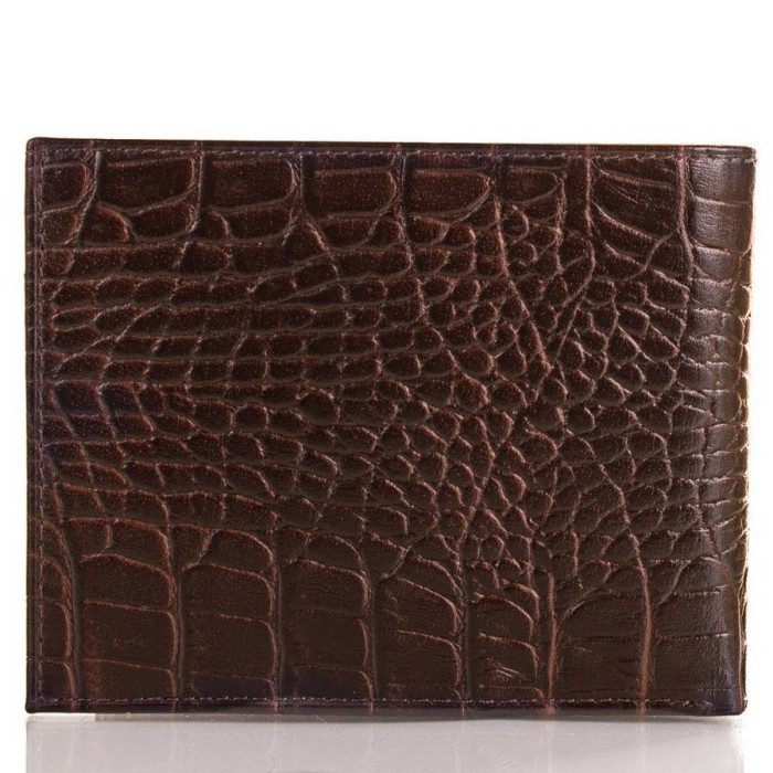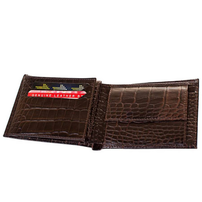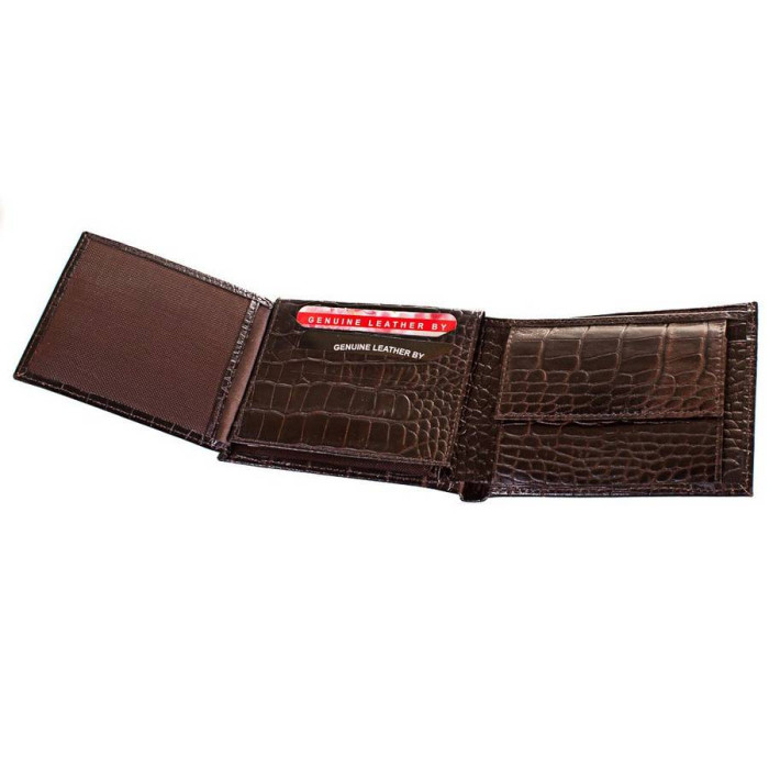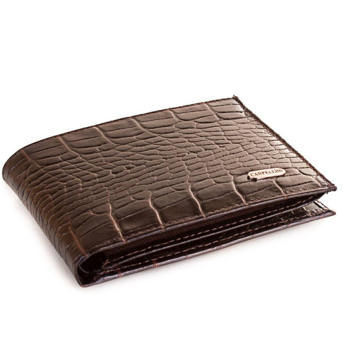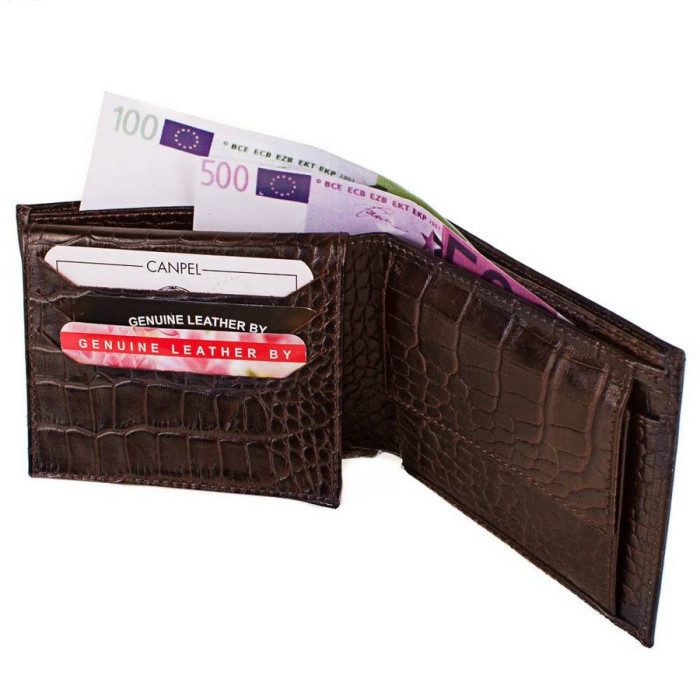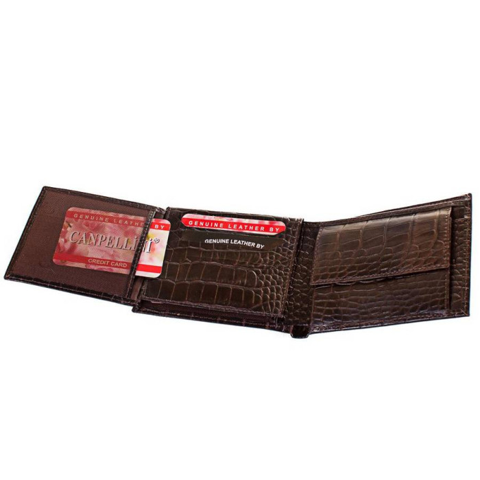 Кількість основних відділень (для купюр): 2. Відділення для фотокарток, перепусток, проїзних квитків та інших документів: 3. Відділення для візиток, банківських та дисконтних карток: 6. Відділення для дрібниці: 1. Кишеня-монетниця закривається за допомогою клапана і механічної кнопки. Матеріал виробу: полірована шкіра під крокодила. Колір: дуже темний коричневий (ближче до чорного). Колір фурнітури: срібло. Розміри (X*Y*Z): 12,5*9,7*2 см. В розкритому вигляді ширина виробу становить 24,5 см. Аксесуар выплнен без застібки. Виріб упаковано у фірмову коробку з щільного картону. Країна походження торгової марки Canpellini - Туреччина. Гарантія: 1 місяць.