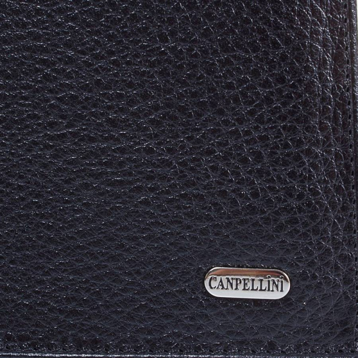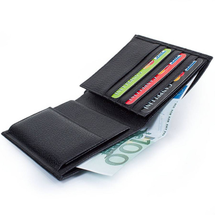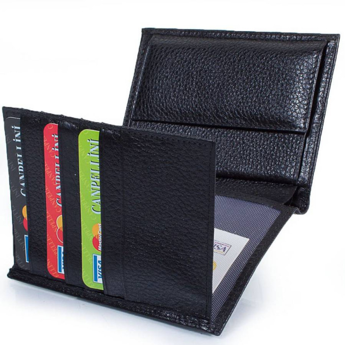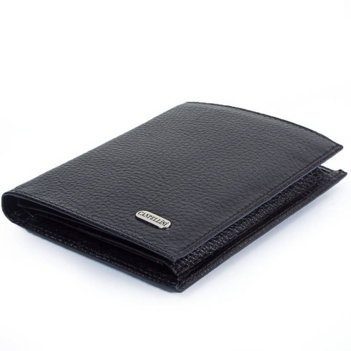Кількість основних відділень (для купюр): 2. Відділення для фотокарток, перепусток, проїзних квитків та інших документів: 2. Відділення для візиток, банківських та дисконтних карток: 6. Додаткові відділення: 1. Відділення для дрібниці: 1. Кишеня-монетниця закривається за допомогою клапана і механічної кнопки. Матеріал виробу: шкіра флотар. Колір: чорний. Колір фурнітури: срібло. Розміри (X*Y*Z): 10*13*2 см. В розкритому вигляді ширина виробу становить 20,5 см. Аксесуар виконаний без застібки. Виріб упакований у фірмову коробку з щільного картону. Країна походження торгової марки Canpellini - Туреччина. Гарантія: 1 місяць.