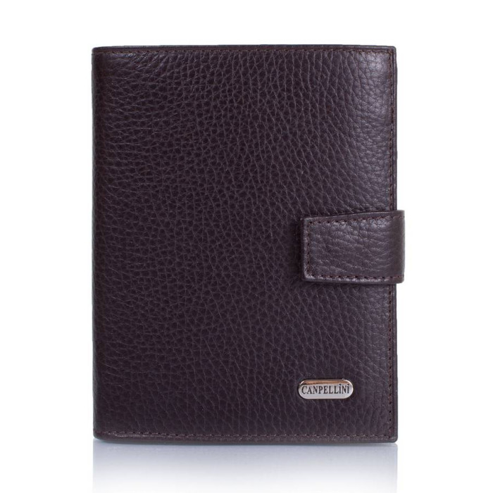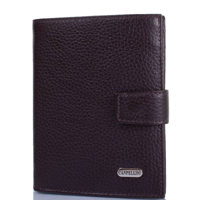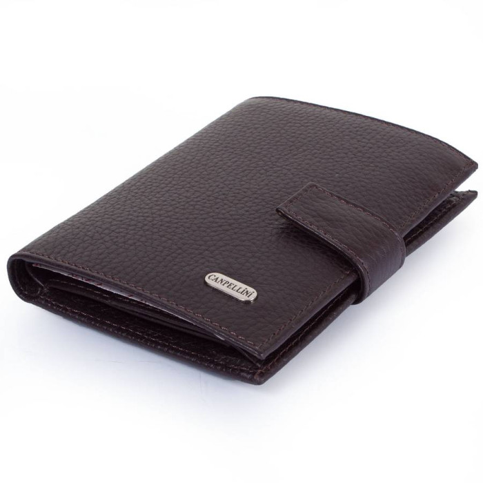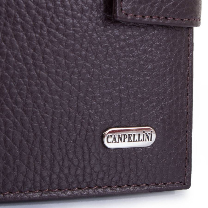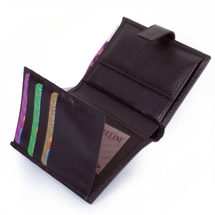 Кількість основних відділень (для купюр): 2. Відділення для фотокарток, перепусток, проїзних квитків та інших документів: 2 (мають прозоре віконце). Відділення для візиток, банківських та дисконтних карток: 6. Додаткові відділення: 1. Відділення для дрібниці: 1. Кишеня-монетниця закривається за допомогою клапана і механічної кнопки. Матеріал виробу: шкіра. Колір: темний коричневий. Колір фурнітури: срібло. Розміри (X*Y*Z): 10*13*2 см. В розкритому вигляді ширина виробу становить 20 см. Аксесуар закривається за допомогою хлястика на механічній кнопці. Виріб упаковано в фірмову картонну коробку. Країна походження ТМ Canpellini - Туреччина. Гарантія: 1 місяць.
