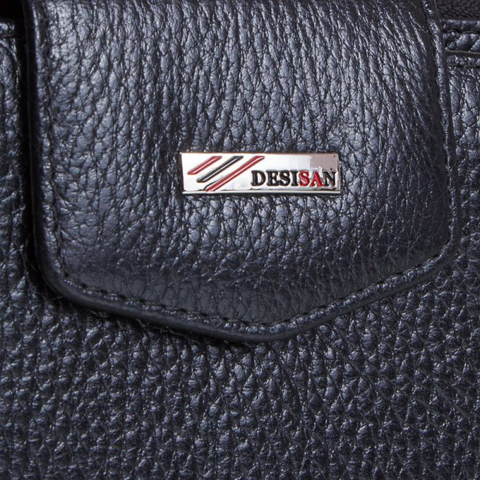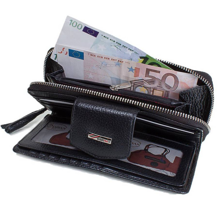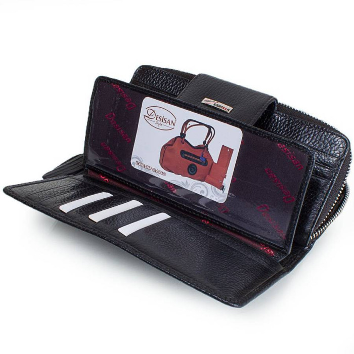 Кількість основних відділень: 1. Основне відділення містить 2 секції для купюр, кишеня-монетницу на блискавці і прозорий накладна кишеня. Кількість додаткових відділень: 1. У ньому є відділення для документів, фотокарт і перепусток: 3 (мають прозоре віконце), 14 відділень для банківських дисконтних і візитних карток, два накладних кишені. На тильній стороні аксесуара розташована прорізна кишеня на блискавці. Матеріал виробу: шкіра. Колір: чорний. Колір фурнітури: срібло. Розміри (X*Y*Z): 19*9 (у розгорнутому вигляді 20 см)*3 см. Основне відділення аксесуара закривається за допомогою блискавки, додатковий - за допомогою хлястика і магнітної кнопки. Виріб упаковано в фірмову картонну коробку. Країна походження торгової марки Desisan - Туреччина. Гарантія: 1 місяць.