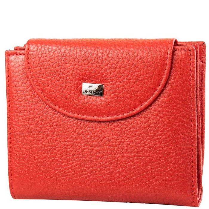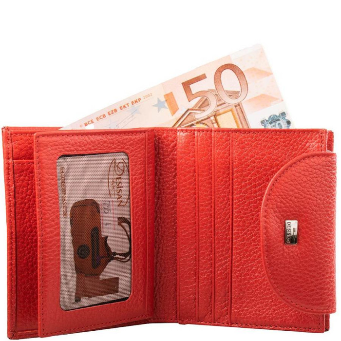 Розміри (X * Y * Z): 9,5 х 12 х 3 см. Ширина в розкритому вигляді: 19 см. Матеріал виробу: шкіра. Колір: червоний. Колір фурнітури: срібло. Кількість відділень для купюр: 2. Гарантія: 1 місяць. Додаткові відділення: 5. Відділення для карт: 9. Відділення для дрібниці: 1. Монетниця поділена на два відсіки і закривається за допомогою блискавки. Відділення з прозорим віконцем:: 1. Аксесуар закривається за допомогою клапана на механічній кнопці. Виріб упаковано в фірмову картонну коробку. Країна походження ТМ Desisan - Туреччина.