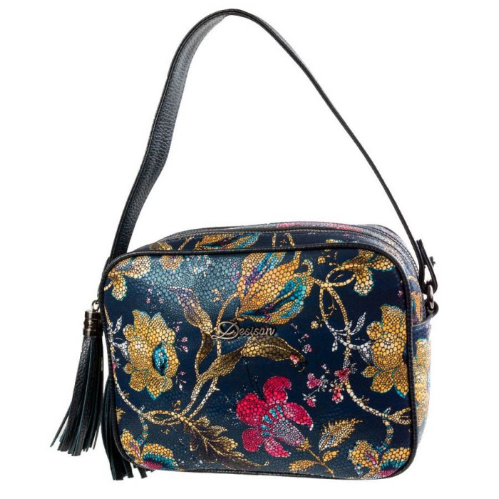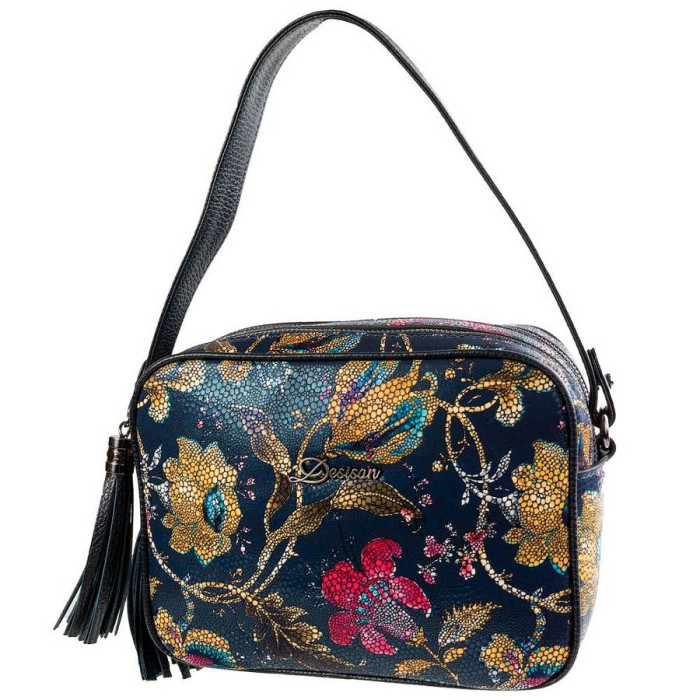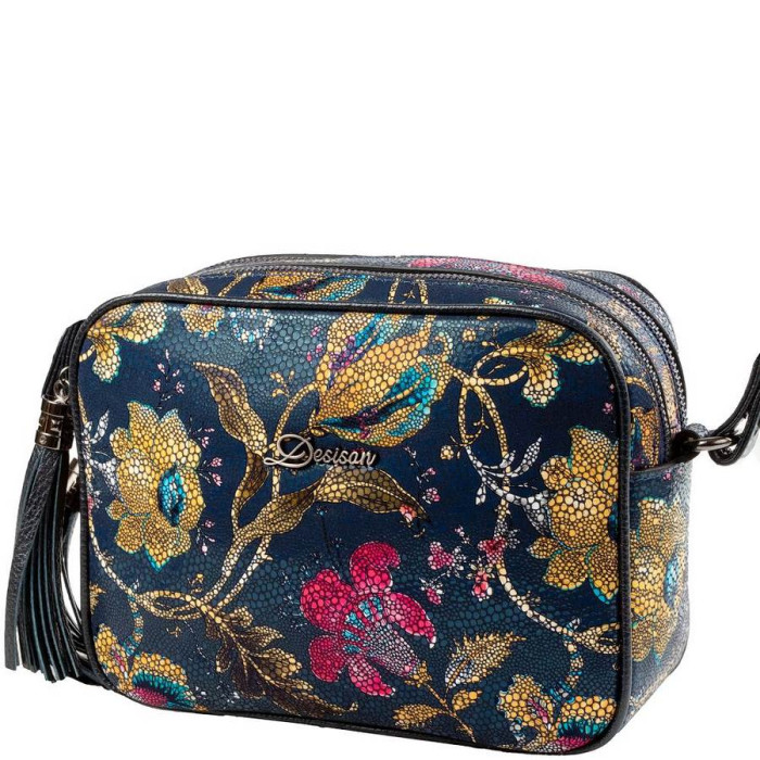 Різнобарвна, стильна і яскрава сумочка зручніше-повсякденного формату-зручна деталь жіночого гардеробу. З нею можна відправитися куди завгодно, доповнивши костюм оригінальним аксесуаром, підкресливши потрібні колірні нюанси в образі або просто додавши виразності монохромного базового поряд. Модель торгової марки DESISAN виглядає цікаво, вона незвичайна і виділяється в ряду звичної шкіргалантереї кольоровим малюнком на темно-синьому тлі. Натуральна шкіра брендової сумки, міцна фурнітура роблять її носком, презентабельною. Фірмова емблема скромно, але виразно присутня на лицьовій стороні. Окантовка зовнішніх швів, наявність ручки і пристібного ременя, два роздільних відсіку на блискавках, підручні Пензлики-брелоки на собачках-кожен штрих виробу продуманий, функціональний, гармонійний. Купити жіночу шкіряну сумку можна в магазині "OlaBags". Ціна-оптимальна.
