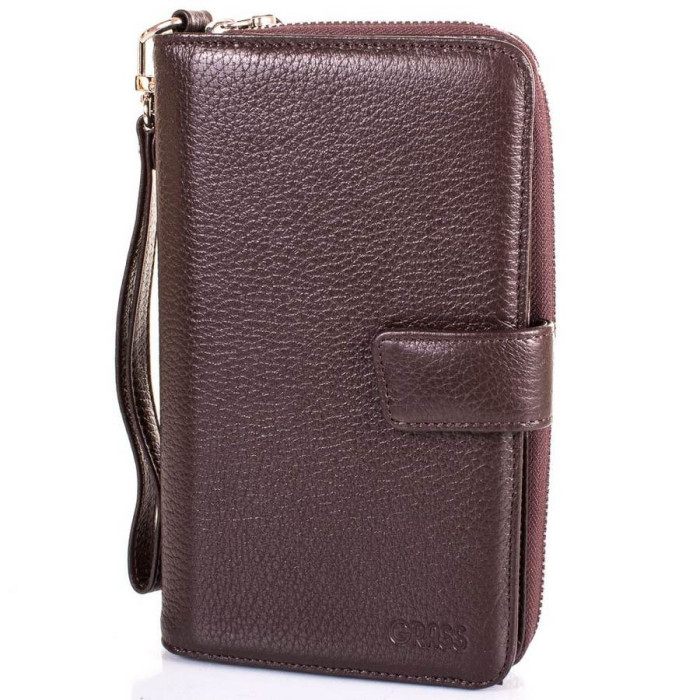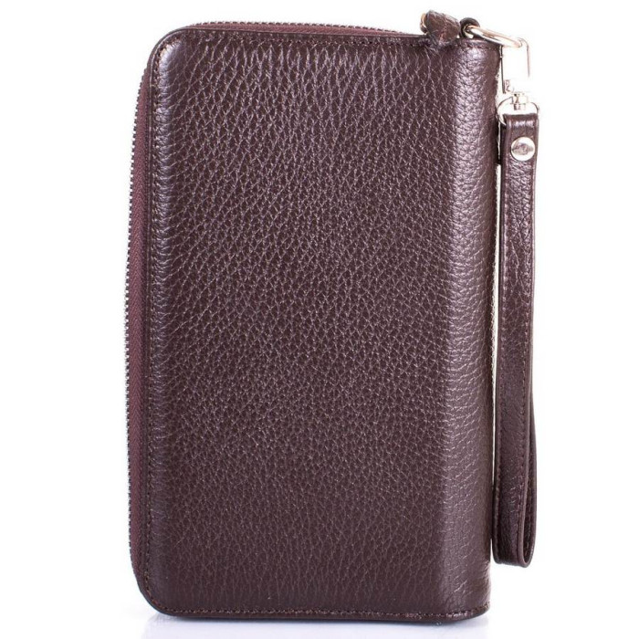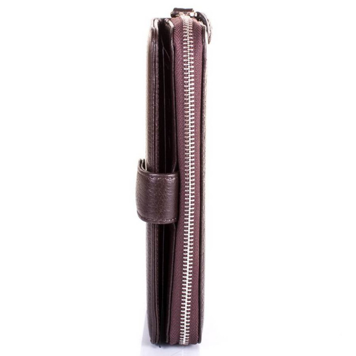 Виріб поділено на дві частини. В одній є: 2 секції для купюр, 3 кишеньки для візиток і банківських карт, 2 кишеньки для СІМ-карт і карт пам'яті. Друга частина включає: 14 кишені для візиток, банківських та дисконтних карток, 6 додаткових відділень, 1 кишеня для перепусток, фотокарт і дрібних документів (з прозорим віконцем). У комплект до моделі додається знімний зап'ястного ремінець-петля. Його довжина не регулюється і становить 20 см. Барсетка придатна до носіння в руці, на зап'ясті. Виріб має жорсткий каркас. Це означає, що воно не буде м'ятися і деформуватися в процесі використання. Підкладка виготовлена з щільної тканини. Матеріал: шкіра флотар. Колір: темний коричневий. Колір фурнітури: срібло. Зовнішні розміри: 21*12,5*3 см. Виріб закривається за допомогою блискавки (одна частина) і хлястика на магнітній кнопці (інша).. Документи формату А4 не поміщаються у виробі. Аксесуар упакований в поліетиленовий пакет, а також фірмову тканинну сумку. Країна походження торгової марки Canpellini - Туреччина. Гарантія: 3 місяці.
