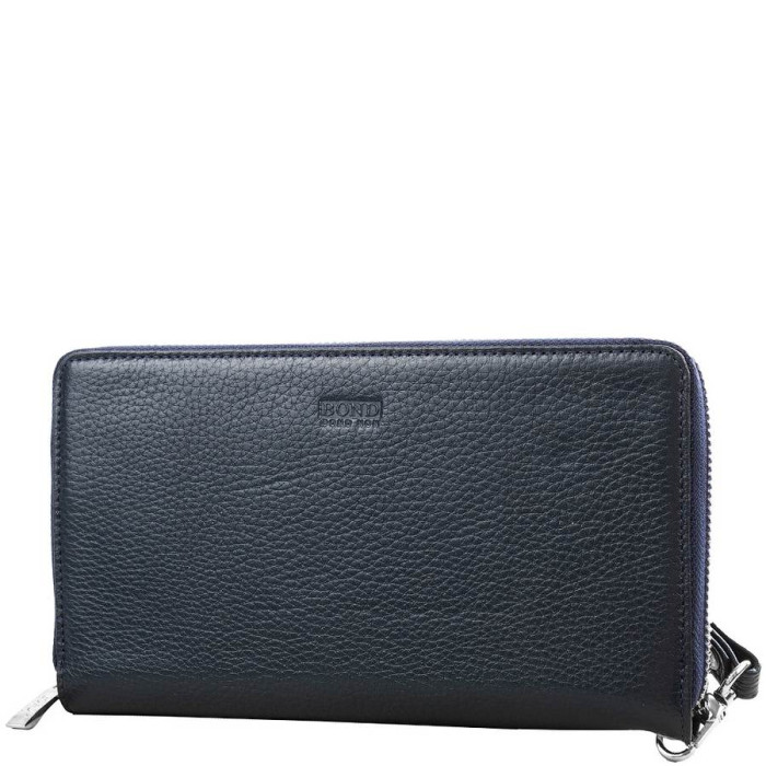Розміри: 21 *12*2 см. Матеріал: шкіра. Колір: синій. Колір фурнітури: срібло. Кількість основних відділень: 2. Всередині монетниця, яка закривається за допомогою блискавки; 2 додаткових відділення; 12 кишень для візиток або карт. На тильній стороні розташований кишеню на блискавці. В комплект входить зап'ястний ремінець-петля. Барсетка придатна до носіння в руці і на долоні. Підкладка виготовлена з щільної тканини. Виріб закривається за допомогою блискавки. Аксесуар упакований у фірмову коробку. Країна походження торгової марки BOND - Туреччина. Гарантія: 1 місяць.