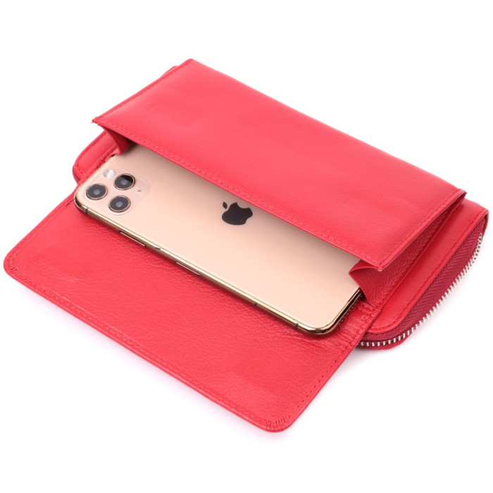 Яркий місткий гаманець-клатч для жінок з натуральної шкіри в красивому червоному кольорі, з використанням добротного текстилю (внутрішня підкладка). Використовується якісна фурнітура кольору срібла. Клатч одночасно, компактний і функціональний, в нього можна помістити свій телефон, щоб не заважав в руках. Запакований у фірмову коробку білого кольору.