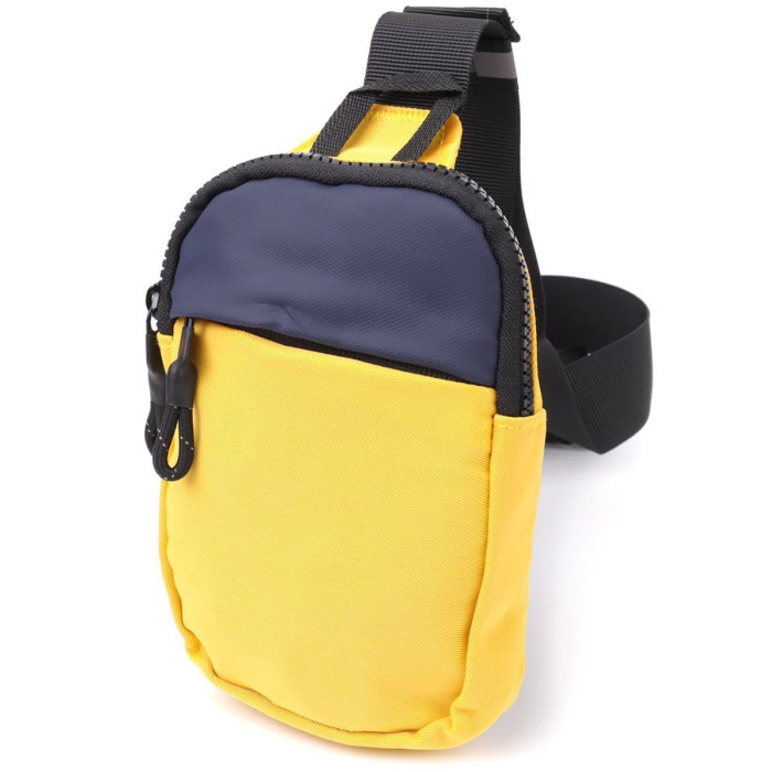Практична сумка слінг біг, яка підійде як для повсякденного використання, так і подорожі, коли всі цінні речі повинні бути в безпечному місці і під рукою. Аксесуар виготовлений з якісного текстилю блакитного кольору, з контрастними вставками чорного кольору, що надає йому ексклюзивного вигляду та стилю. У моделі використано якісну фурнітуру чорного кольору. Сумка легко вміщує паспорт, телефон, ключі, гаманець та ще кілька дрібниць. Якщо Ви шукаєте зручну та легку сумку, яка задовольнить Вас за такими параметрами, як - міцність, практичність, місткість, ексклюзивність, універсальність, то ця модель перед Вами, вона має всі вищеперелічені якості та стане одним з Ваших улюблених аксесуарів.