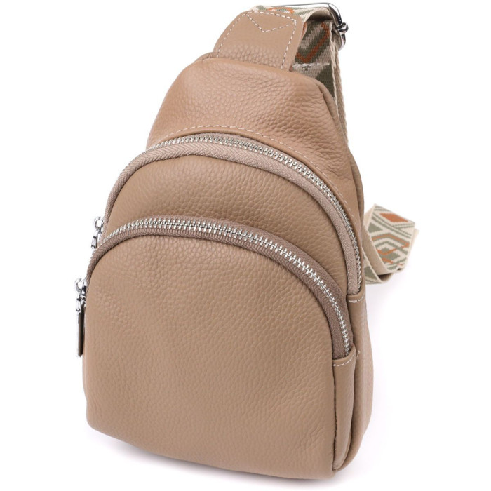 На особливу увагу заслуговує регульований текстильний ремінь з яскравим стильним візерунком - він не тільки забезпечує комфортну посадку на тілі, але і стає виразним елементом дизайну. Ремінь незнімний, але легко регулюється під ваше зростання і спосіб носіння. Фурнітура виконана в сріблястому кольорі, що надає аксесуару сучасний і стриманий блиск, який чудово поєднується з текстурою шкіри та акцентами ременя.
