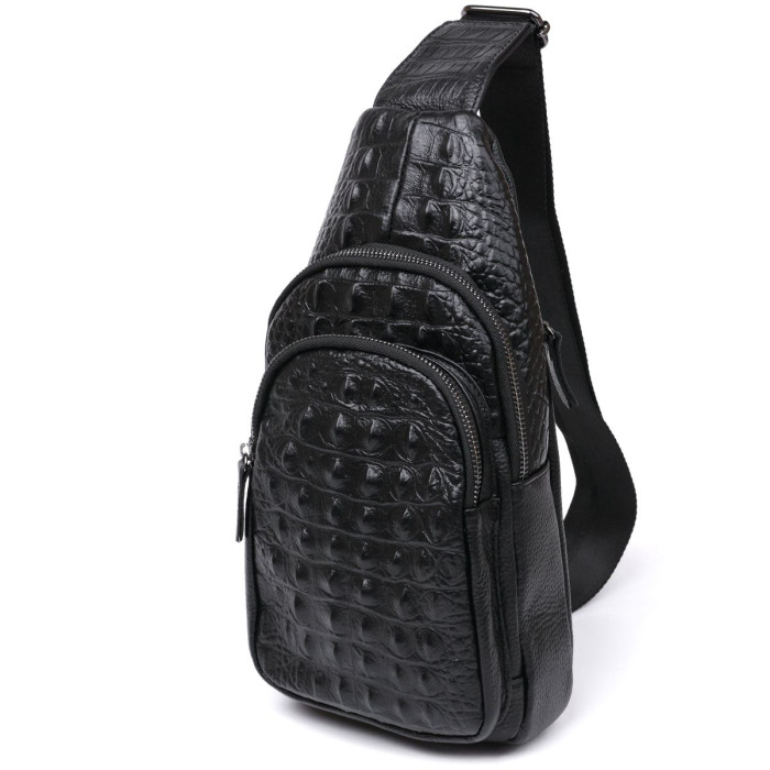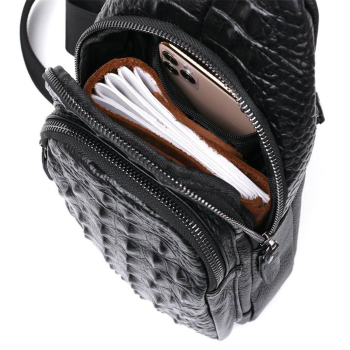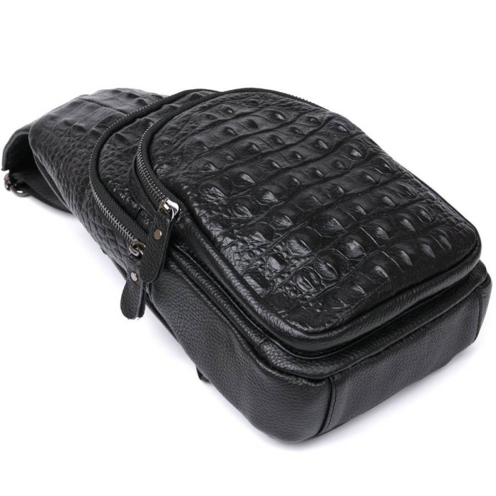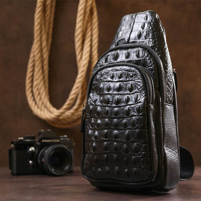 Відмінна чоловіча сумка через плече в сучасному модному дизайні. Виконано виріб з натуральної шкіри високої якості, має приємну на дотик фактуру з тисненням під шкіру крокодила. Основне відділення досить просторе та містке, на зовнішній стороні також є дві кишені, що дуже зручно у використанні.
