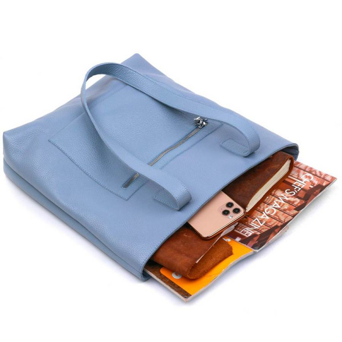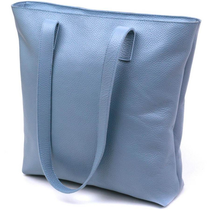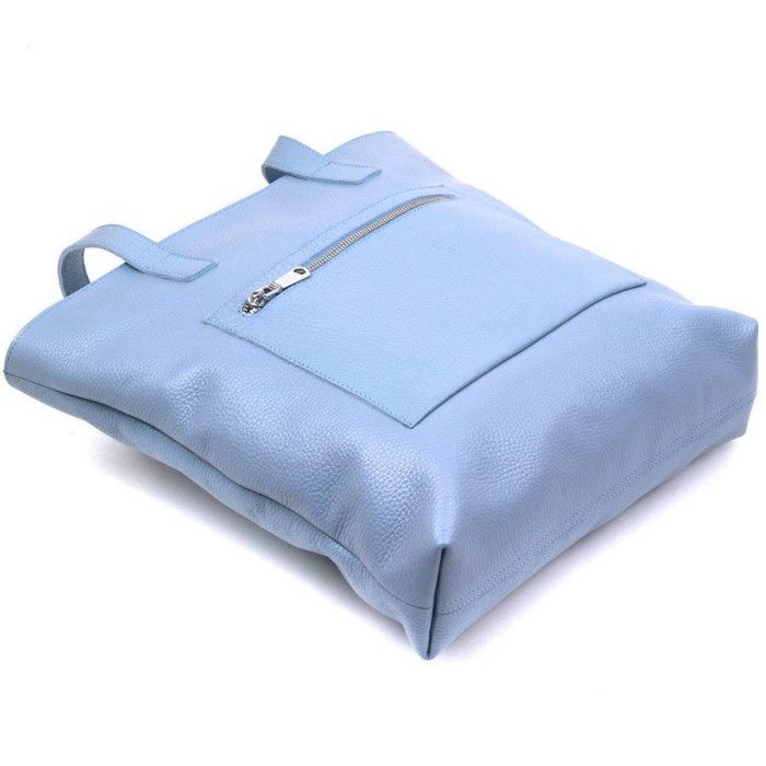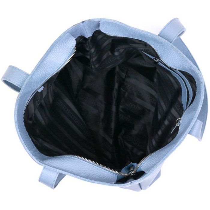 Стильна та сучасна жіноча сумка у ніжному блакитному кольорі та зернистій фактурі. Виконано модель з натуральної шкіри, високу якість якої Ви відразу відчуєте, як візьмете сумку до рук. Усередині розташоване одне просторе відділення з невеликою потайною кишенею на блискавці. На зовнішньому боці також є кишеня на блискавці.