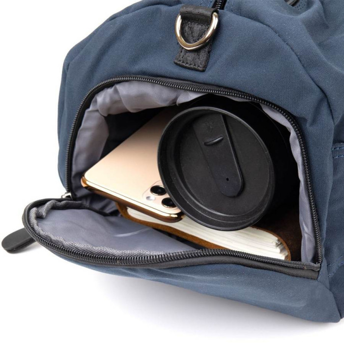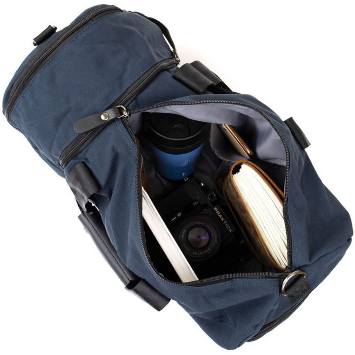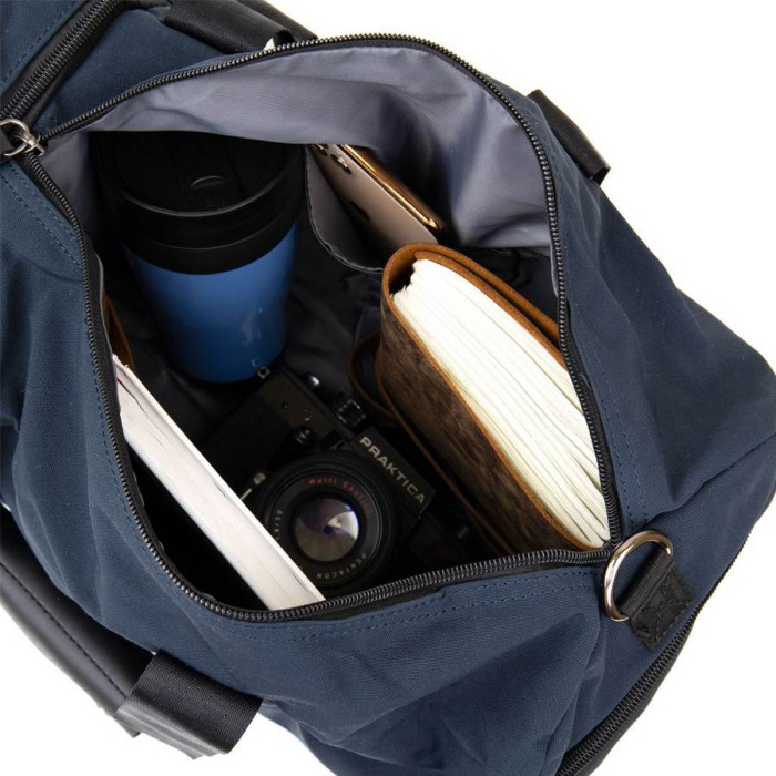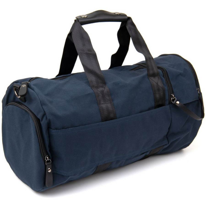 Текстильна дорожня сумка універсального і не мазкого темно-синього кольору. Сумка підійде як для занять спортом, так і в якості дорожньої сумки. Виріб дуже практичний і не важкий. Таким чином помістивши свої речі в сумку вона не стане зовсім непідйомною. Сумка має компактні розміри і стане хорошим варіантом для відрядження. В сумку можна зручно помістити пару кросівок до відповідного відділення. У сумці також є петелька для носіння каремата або килимка (щоб його зафіксувати). Сумка з текстилю - ідеальний бюджетний варіант.