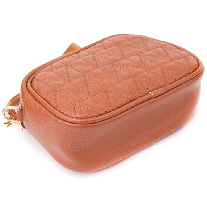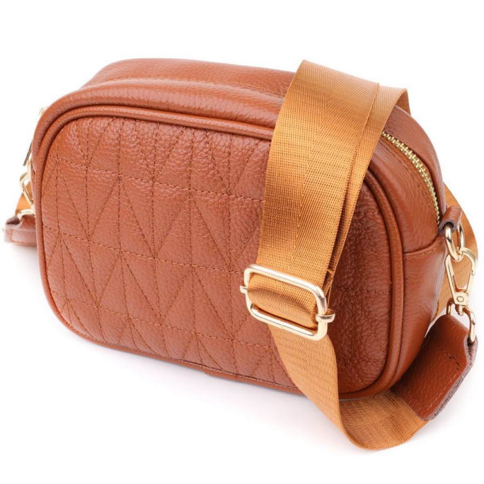 Елегантна руда стьобана сумка Vintage із натуральної шкіри стане стильним акцентом у вашому гардеробі, додаючи образу тепла та вишуканості. Компактна форма підкреслює акуратний силует, а стібка на лицьовій стороні надає аксесуару особливої чарівності. Сумка закривається на блискавку, всередині розташоване основне відділення з кишенею на блискавці та відкритою кишенею для дрібниць, а на тильній стороні знаходиться зовнішня кишеня на блискавці, яка робить використання ще зручнішим. Знімний текстильний ремінь, що регулюється, забезпечує комфорт при носінні, а фурнітура під жовте золото стильно відтінює насичений рудий колір шкіри. Ця модель легко підходить як для повсякденних образів, так і для особливих випадків, підкреслюючи жіночність та витончений смак своєї власниці.
