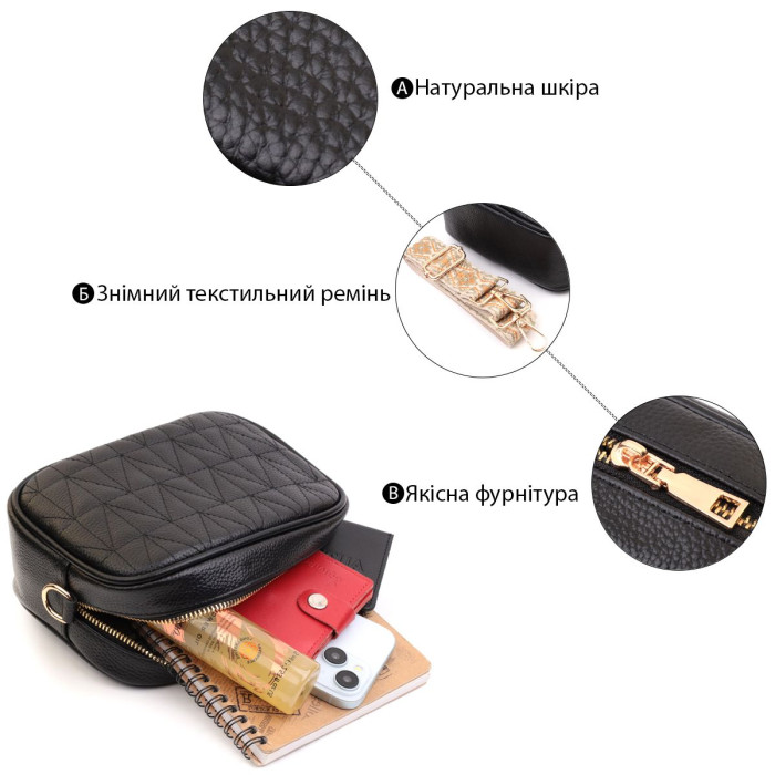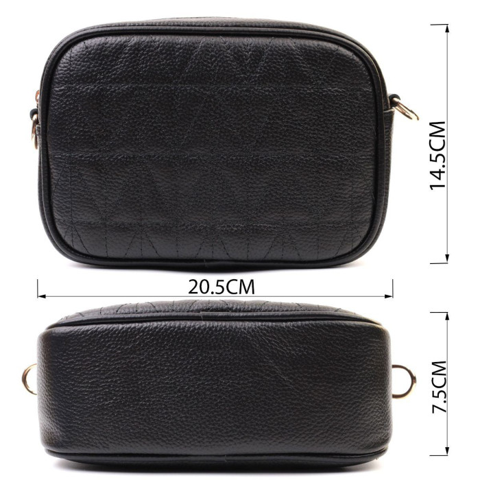 Практична сумка для жінок на всі випадки життя із натуральної якісної шкіри. Аксесуар складається з основного відділення, яке закривається на блискавку, кишені відкритого типу всередині, а також кишені на блискавці зовні на задній стороні. Носити сумку можна в руці, під рукою, на плечі і через плече, для цього є текстильний ремінь, що знімається. В аксесуарі використано якісну фурнітуру кольору золота.