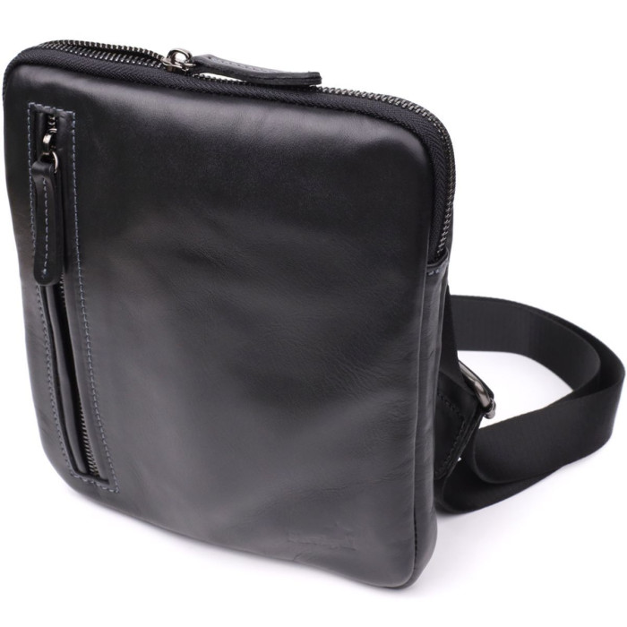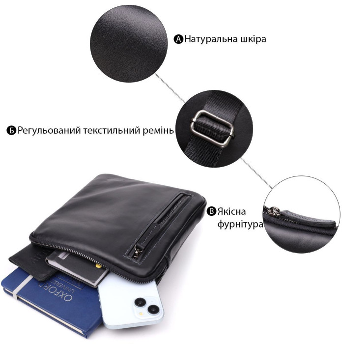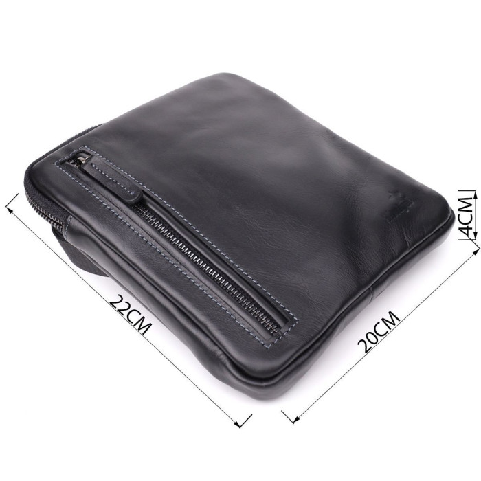Елегантна чоловіча вертикальна сумка із натуральної гладкої шкіри глибокого чорного кольору. Мінімалістичний дизайн та акуратне оздоблення підкреслюють статус власника та роблять аксесуар універсальним для будь-якого стилю – від класичного до повсякденного.