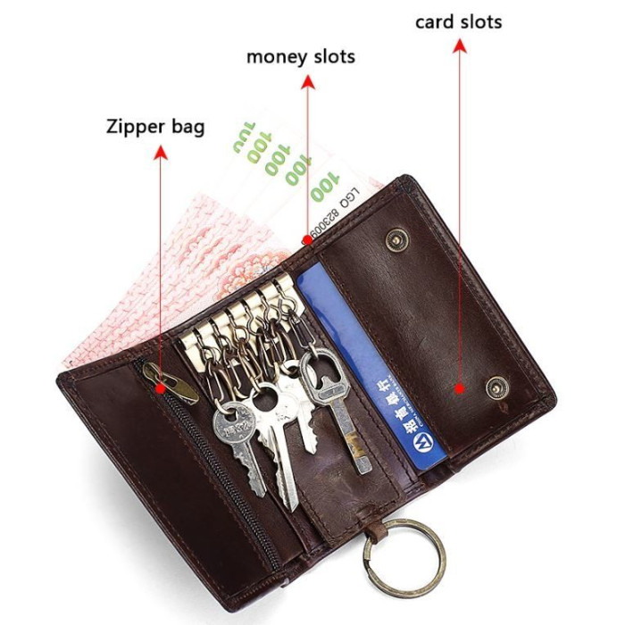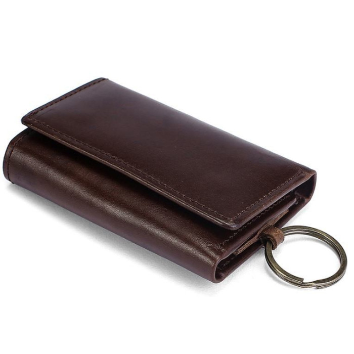 Дуже функціональна ключниця, коричневого кольору, виготовлена з натуральної шкіри високої якості. Складається виріб з шести карабінів для ключів і двох кишеньок, одна на блискавці і одна відкрита. У доповненні йде брелок. У ключниці є також відділення для купюр. Стильний висококласний аксесуар для сучасних ділових людей.