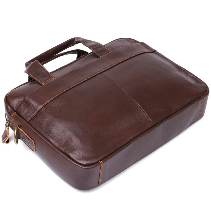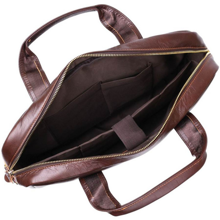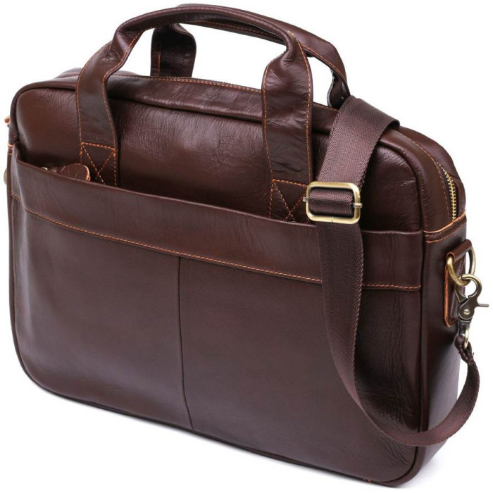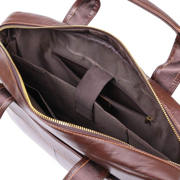 Чудова містка чоловіча сумка для ноутбука у красивому насиченому коричневому кольорі. Матеріал виготовлення - натуральна високоякісна шкіра з відмінними характеристиками. Виріб має гладку і приємну на дотик фактуру. Усередині є спеціальне відділення для ноутбука на липучці, кишені для телефону та маленька потайна кишеня на блискавці. На зовнішній стороні також є місткі кишені.