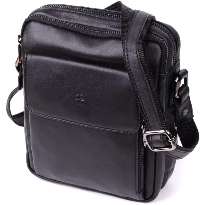 Шкіряна сумка від Tony Perotti – зручний та функціональний аксесуар для сучасного чоловіка. Виріб виконаний з м'якої телячої шкіри та відрізняється продуманою організацією внутрішнього простору. Два основні відділення та додаткові кишені дозволяють акуратно розмістити документи, телефон та особисті речі. Комбінований ремінь на плечі забезпечує комфорт при носінні, а фурнітура кольору темний нікель і фірмове тиснення «троянда вітрів» підкреслюють лаконічний дизайн і приналежність до колекції Cortina.