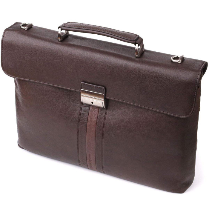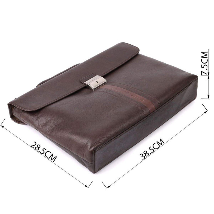 Шкіряний портфель Tony Perotti коричневого кольору з контрастною вставкою поєднує елегантність та продуману функціональність. Основне відділення та додаткові кишені дозволяють зручно зберігати документи, телефон та канцелярське приладдя, а знімний регульований ремінь та верхня ручка забезпечують комфорт при перенесенні. Брендована підкладка та тиснення підкреслюють преміальний стиль виробу.