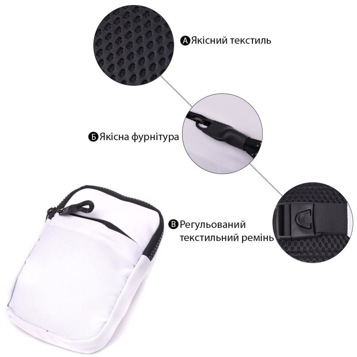 Представляємо відмінний варіант сумки слінг бег, яка підійде як для повсякденного використання, так і подорожі, коли всі цінні речі повинні бути в безпечному місці і під рукою. Аксесуар виготовлений з якісного текстилю білого кольору, з контрастними вставками чорного кольору, що надає йому ексклюзивного вигляду та стилю. У моделі використано якісну фурнітуру чорного кольору. Сумка легко вміщує паспорт, телефон, ключі, гаманець та ще кілька дрібниць. Якщо Ви шукаєте зручну та легку сумку, яка задовольнить Вас за такими параметрами, як - міцність, практичність, місткість, ексклюзивність, універсальність, то ця модель перед Вами, вона має всі вище перелічені якості та стане одним з Ваших улюблених аксесуарів.