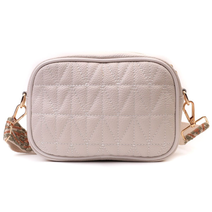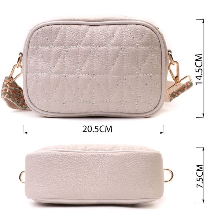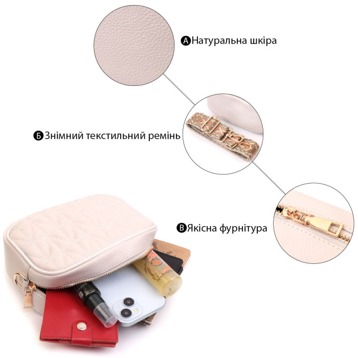 Цікава сумка для жінок на всі випадки життя із натуральної якісної шкіри. Аксесуар складається з основного відділення, яке закривається на блискавку, кишені відкритого типу всередині, а також кишені на блискавці зовні на задній стороні. Носити сумку можна в руці, під рукою, на плечі і через плече, для цього є текстильний ремінь, що знімається. В аксесуарі використано якісну фурнітуру кольору золота.