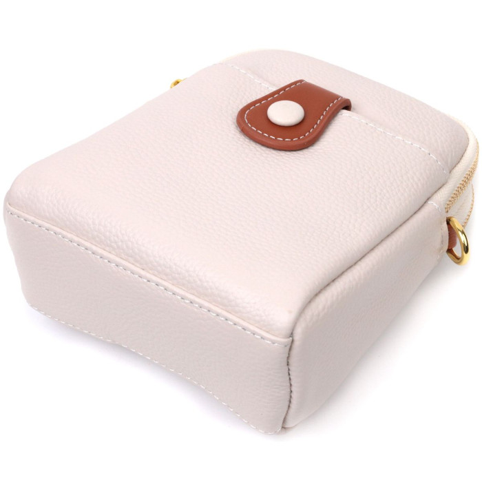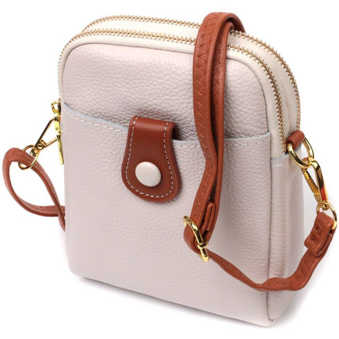 Цікава сумка трапецієподібної форми для стильних та незалежних жінок з натуральної шкіри з високим показником якості та зносостійкості. На лицьовій стороні розташована накладна кишеня, що закривається хлястиком на магніт, хлястик і знімний плечовий ремінь коричневого кольору, що надає сумці стилю. Аксесуар складається з двох відділень, що закриваються на блискавки, всередині яких знаходиться потайна кишеня на блискавці та кишеня відкритого типу. Носити сумку можна на плечі і через плече, для цього є шкіряний ремінь, що знімається. У виробі використано якісну фурнітуру кольору жовтого золота. Універсальний варіант сумки як на вечір так і як сумочка на кожен день.