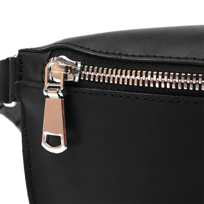 Практична жіноча сумка на пояс у красивому та елегантному дизайні без надмірностей від українського виробника. Матеріал виготовлення – натуральна шкіра високої якості із відмінними експлуатаційними характеристиками. Сумка має універсальний чорний колір та гладку матову фактуру. Ремінь зроблений також із натуральної шкіри і може регулюватися по довжині.